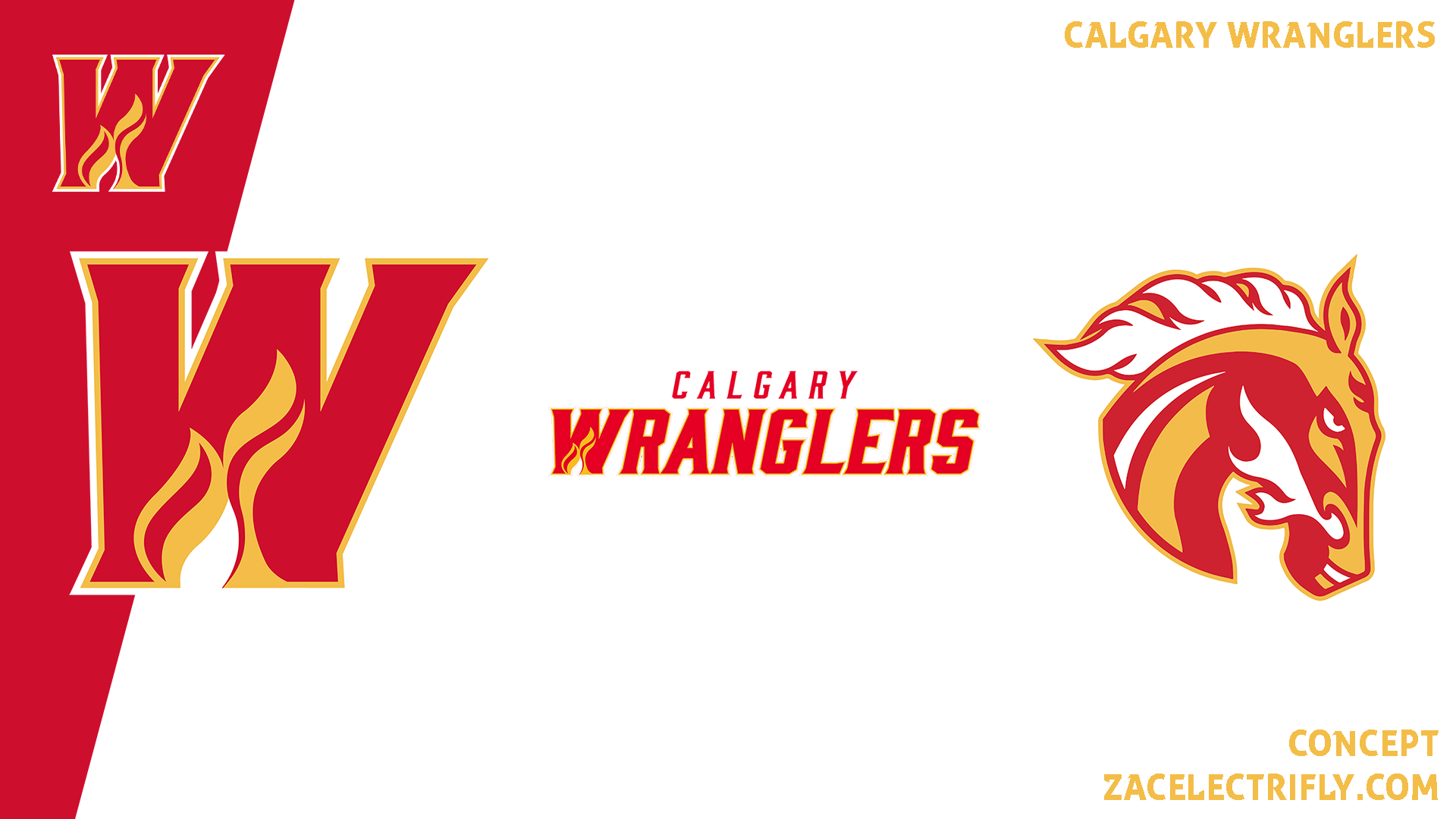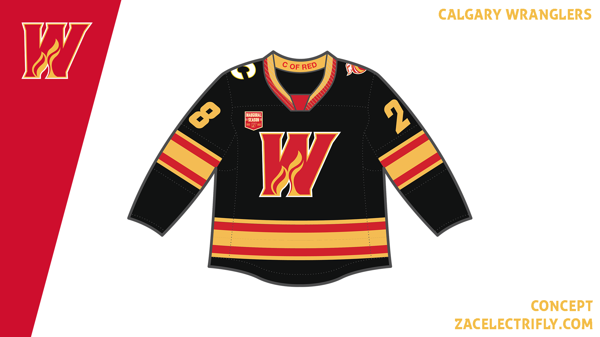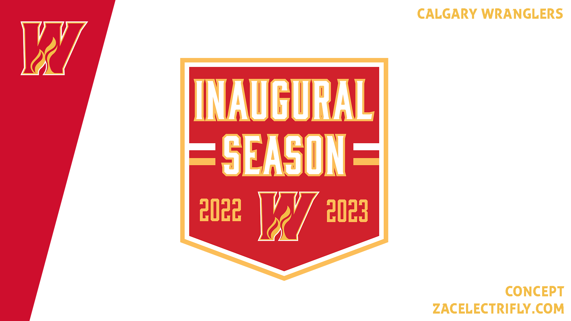 The Calgary Wranglers have three logos. Their primary logo is a W with two yellow flames shooting up. It is inspired by the old Atlanta Flames logo. If the logos are overlaid, the flames are almost identical. Their second logo is just a wordmark logo. Their third logo is a horse head. It is inspired by the Calgary Flames Blasty logo. Their colors are the same as the Calgary Flames, red, yellow, white, and black. I did not make these logos. I did make an inaugural season logo. I took inspiration for the logo from the Calgary Flames 40th anniversary logo. From what I could tell the Wranglers are not doing anything special for their first season in Calgary.