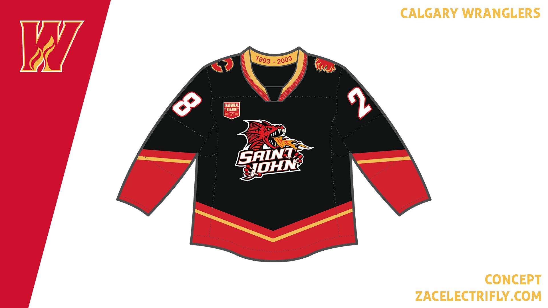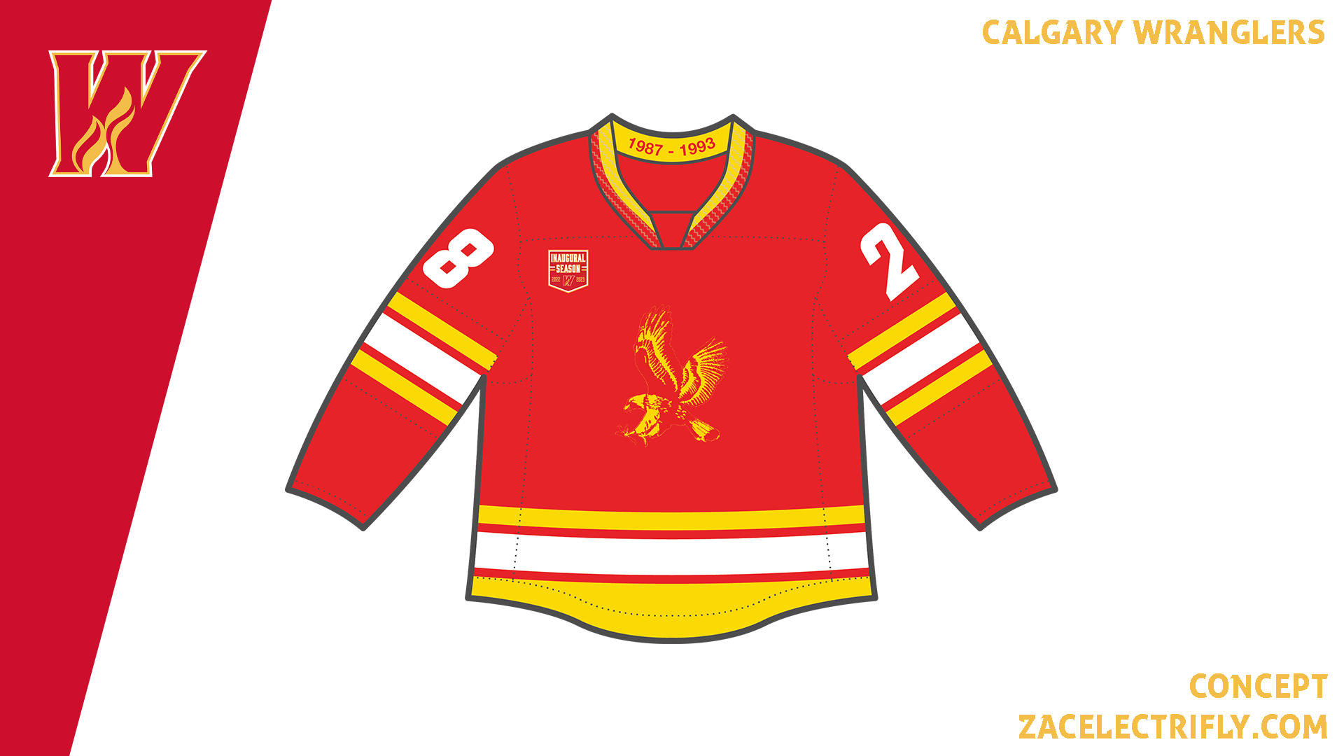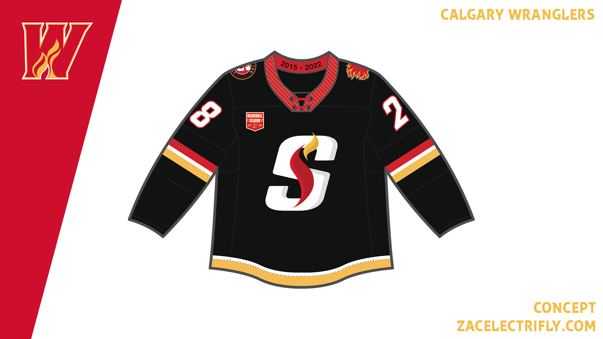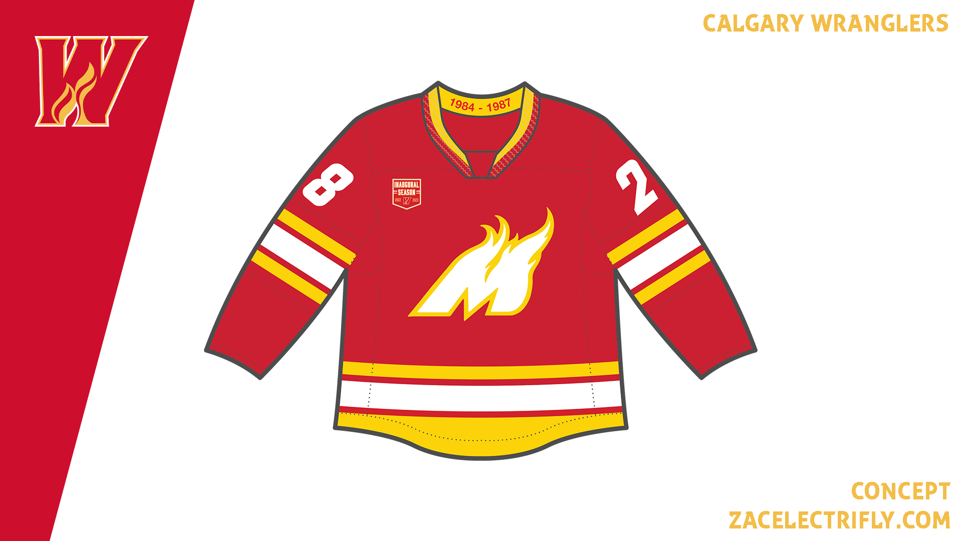 The Calgary Wranglers have three logos. Their primary logo is a W with two yellow flames shooting up. It is inspired by the old Atlanta Flames logo. If the logos are overlaid, the flames are almost identical. Their second logo is just a wordmark logo. Their third logo is a horse head. It is inspired by the Calgary Flames Blasty logo. Their colors are the same as the Calgary Flames, red, yellow, white, and black. I did not make these logos. I did make an inaugural season logo. I took inspiration for the logo from the Calgary Flames 40th anniversary logo. From what I could tell the Wranglers are not doing anything special for their first season in Calgary.