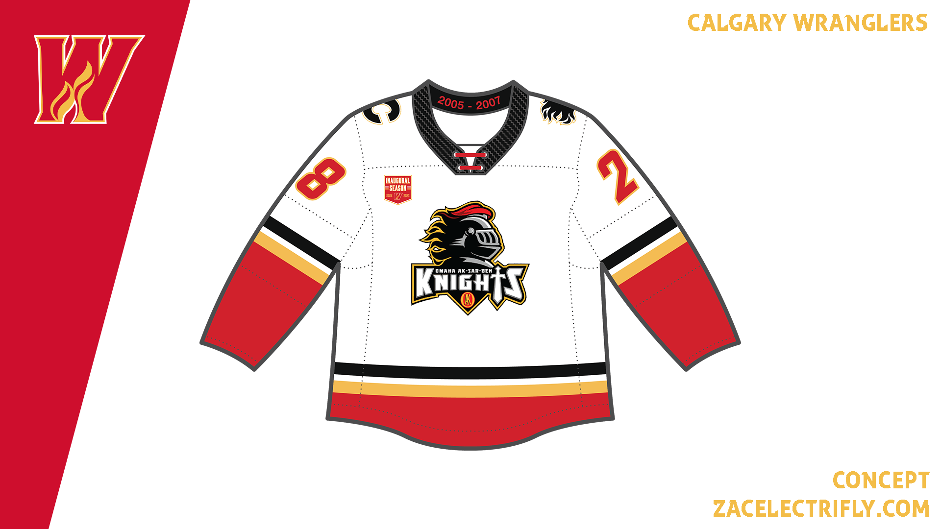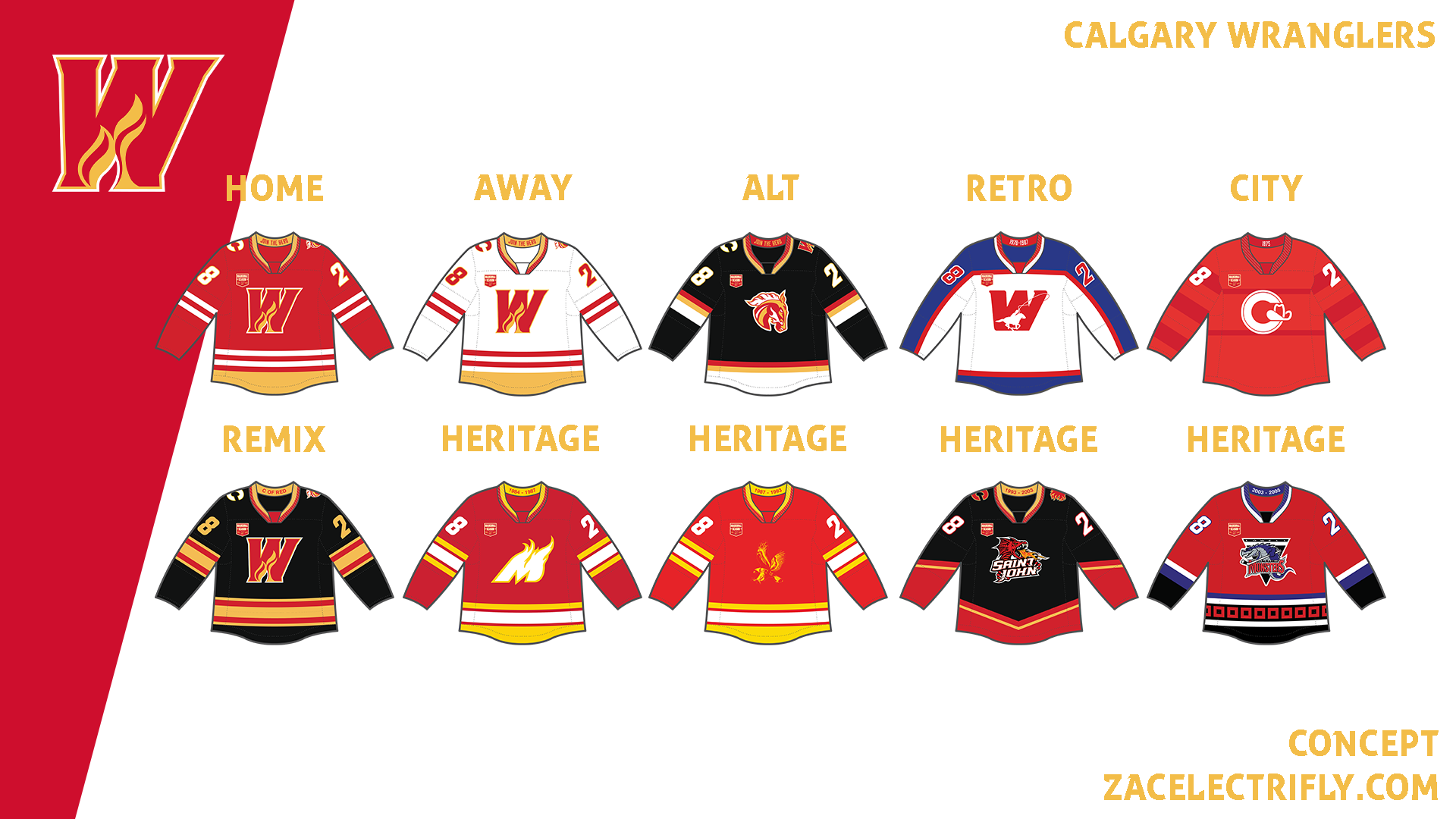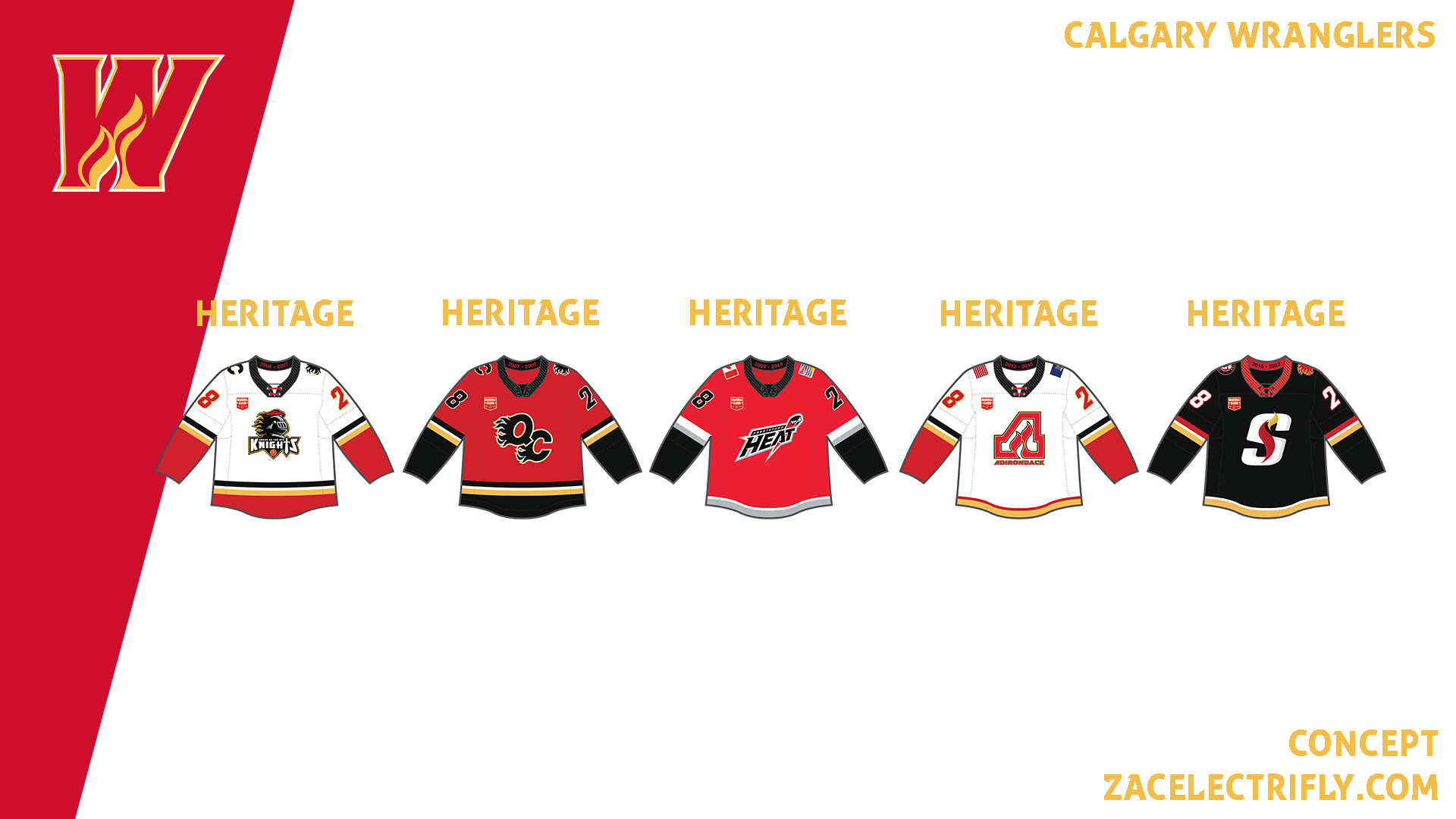 The Calgary Wranglers have nine Heritage jerseys. The Montoc Golden Flames (1984-87), Salt Lake Golden Eagles (1987-93), Saint John Flames (1993-03), Lowell Lock Monsters (2003-05), Omaha Ak-Sar-Ben Knights (2005-07), Quad City Flames (2007-09), Abbotsford Heat (2009-14), Adirondack Flames (2014-15), and the Stockton Heat (2015-2022). The Heritage jerseys are inspired by the Calgary Flames former primary affiliates.