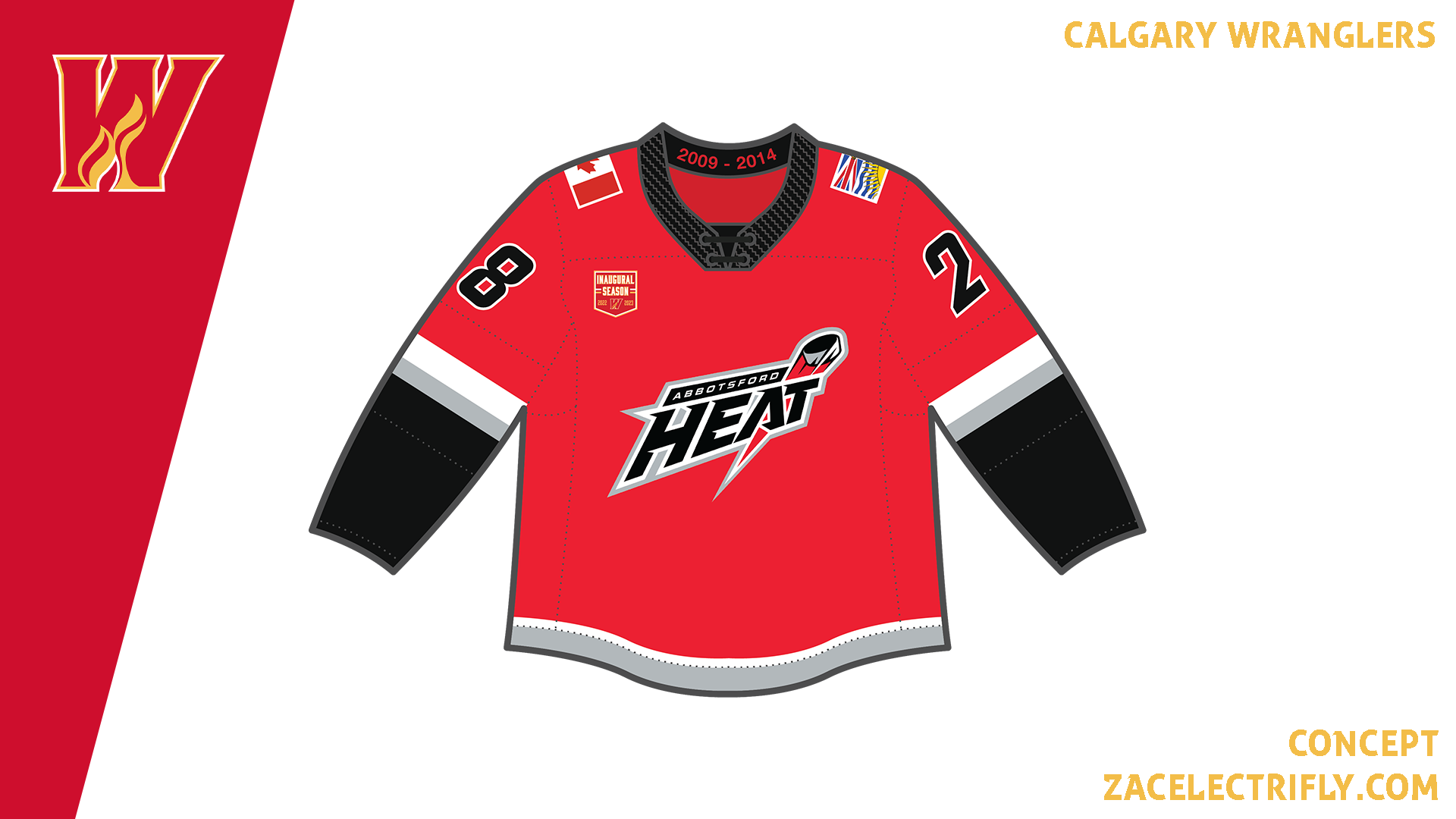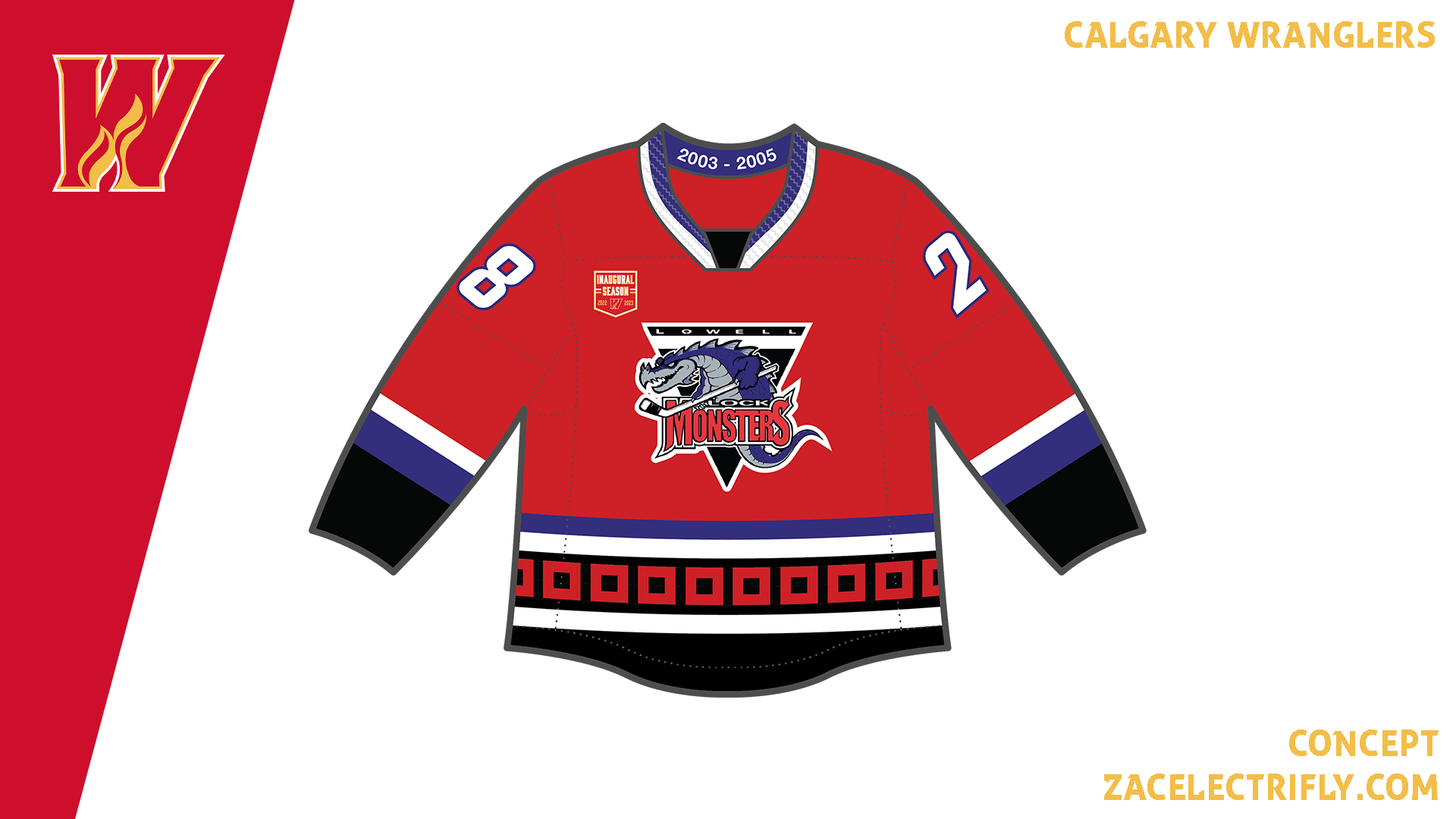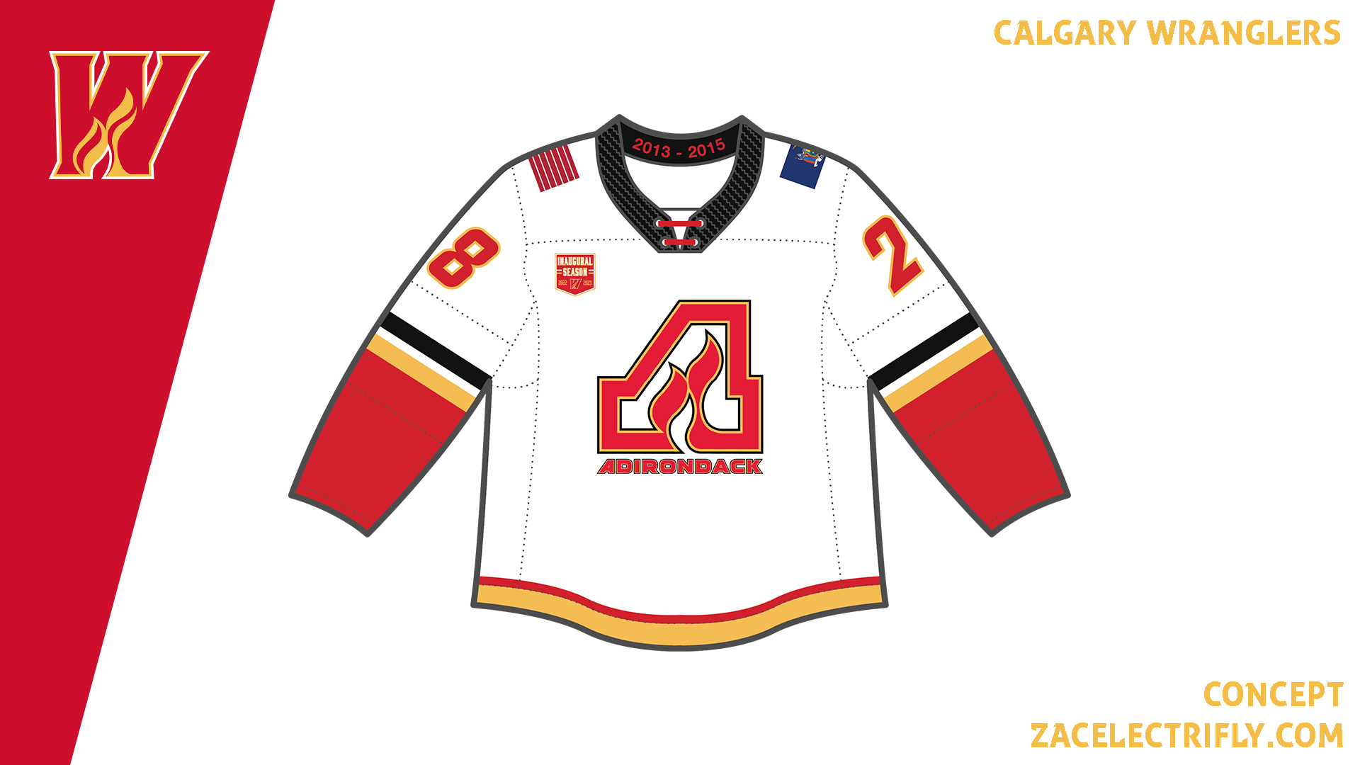 The Calgary Wranglers have nine Heritage jerseys. The Montoc Golden Flames (1984-87), Salt Lake Golden Eagles (1987-93), Saint John Flames (1993-03), Lowell Lock Monsters (2003-05), Omaha Ak-Sar-Ben Knights (2005-07), Quad City Flames (2007-09), Abbotsford Heat (2009-14), Adirondack Flames (2014-15), and the Stockton Heat (2015-2022). The Heritage jerseys are inspired by the Calgary Flames former primary affiliates.