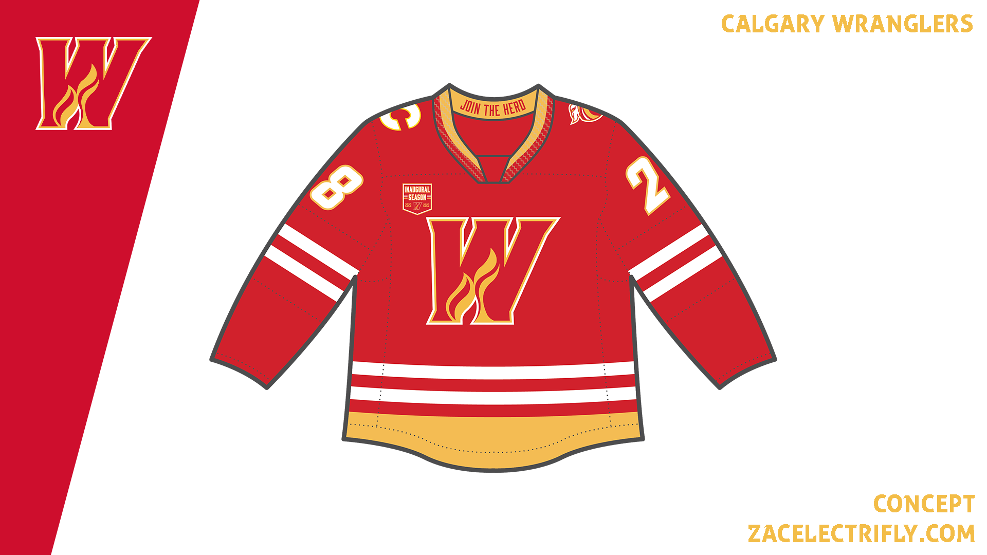 The Home jersey is red, white, and yellow. It has the primary logo on the front. It also has the inaugural logo on the front. The inaugural logo is on all of the jerseys. On the right shoulder is the Calgary Flames white logo. On the left shoulder is the horse logo. The pattern is inspired by the WHA Calgary Cowboys jersey. On the collar, it says “join the herd” which is the Wranglers motto. The Away jersey is white, red, and yellow. It has the same pattern as the Home jersey. It has mostly the same logos. The only change in the logos is the white Calgary Flames logo is replaces with the primary calgary flames logo.