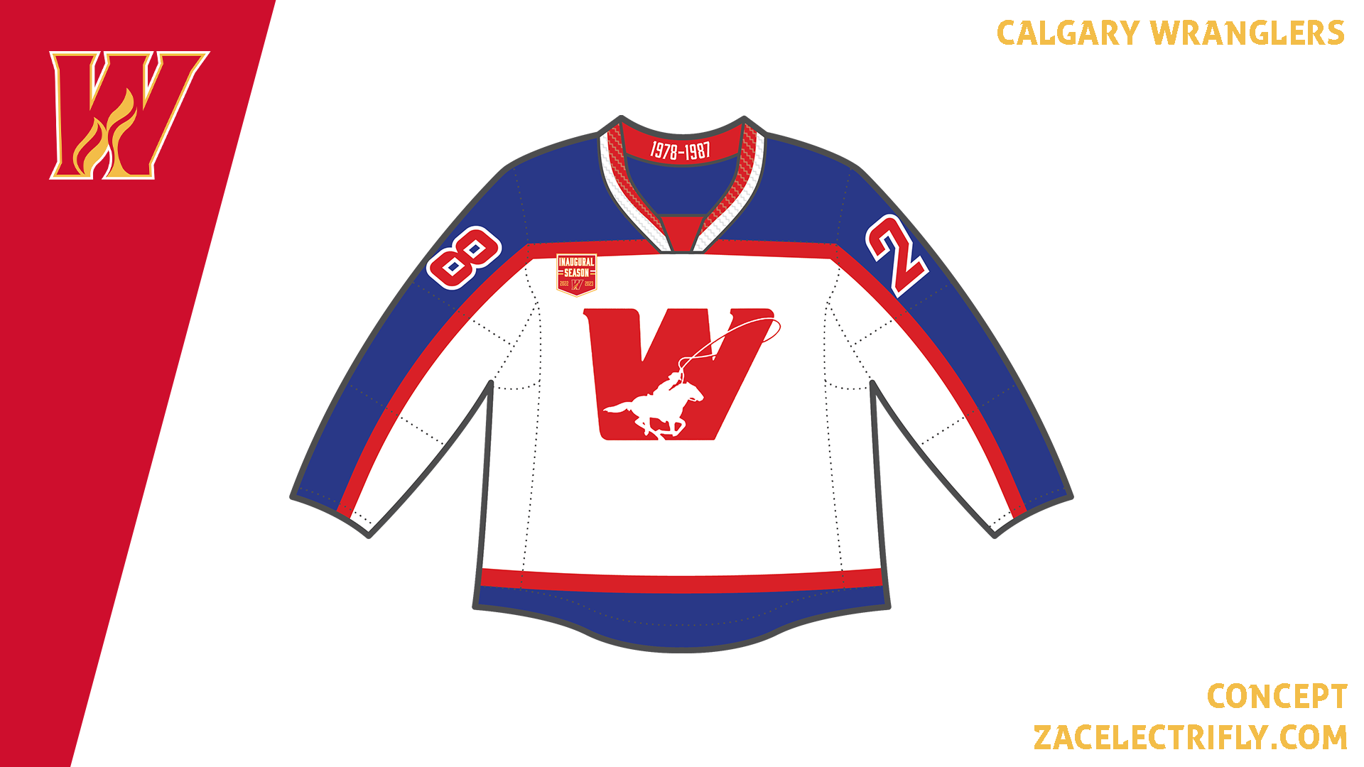 The Retro jersey is inspired by the WHL Calgary Wranglers. It is white, blue, and red. On the front is the logo used from 1984 to 1987. The logo is a W with a cowboy riding a horse and a lasso. This would have been one of their jerseys used between 1984 and 1987. It is unclear when they used this jersey or if it was used as a home, away, or alternate jersey. On the collar, it has 1978-1987 for when the team existed.