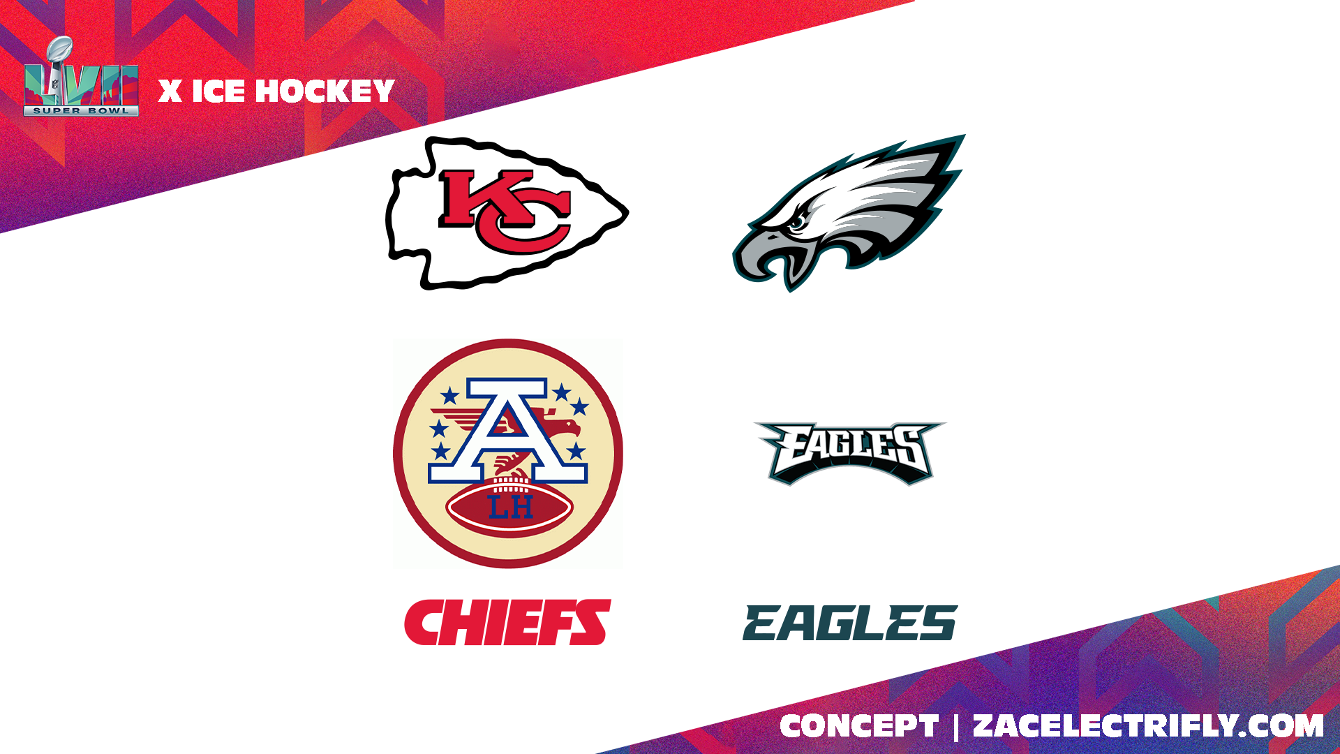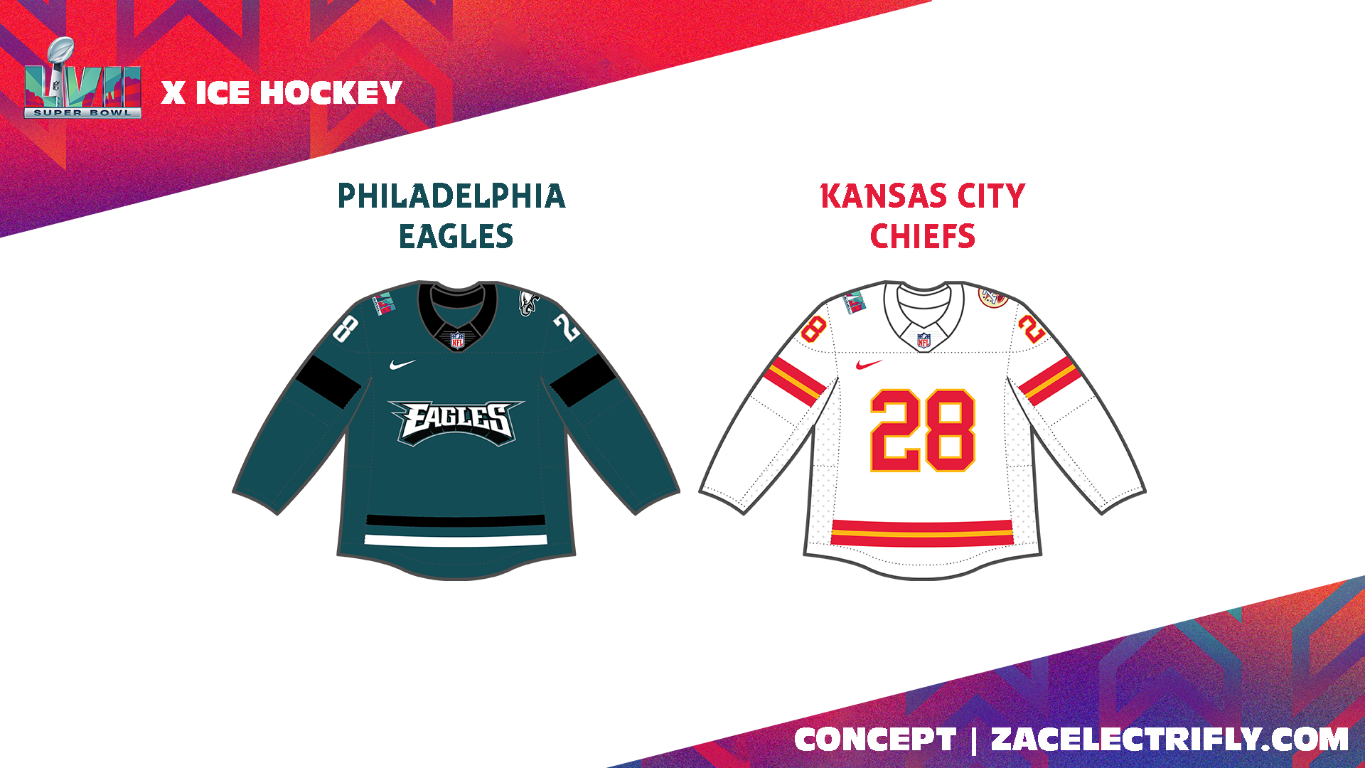 Today is the Super Bowl. This concept will be a lot like most of the concepts in my Qatar 2022 Ice Hockey concept. I used the same logos. Arizona has not hosted an professional outdoor ice hockey game. At this point it doesn’t seem likely that they will anytime soon. It is extremely possible though as State Farm Stadium (the 2023 Super Bowl host) is an indoor stadium. Anyway the Philadelphia Eagles are playing the Kansas City Chiefs in the Super Bowl and I have reimagined it as an ice hockey game.