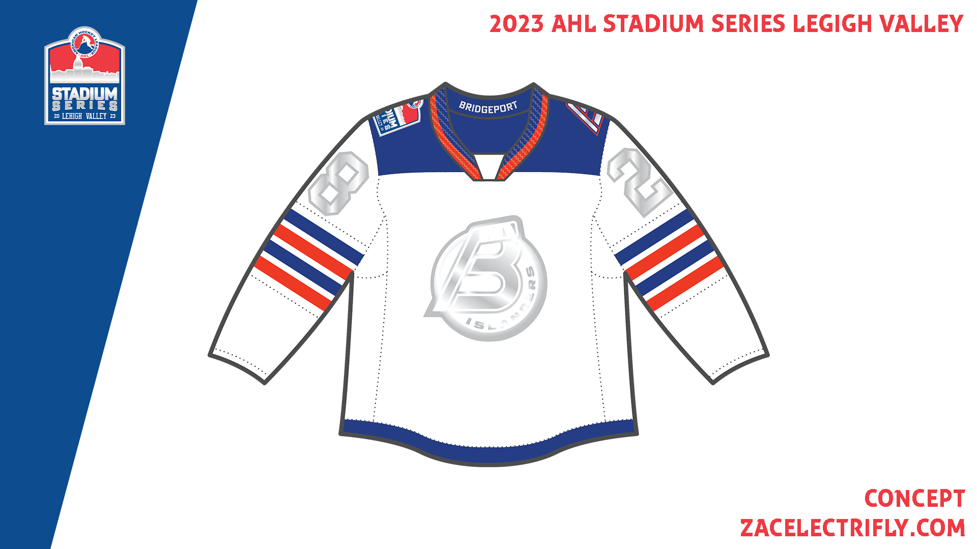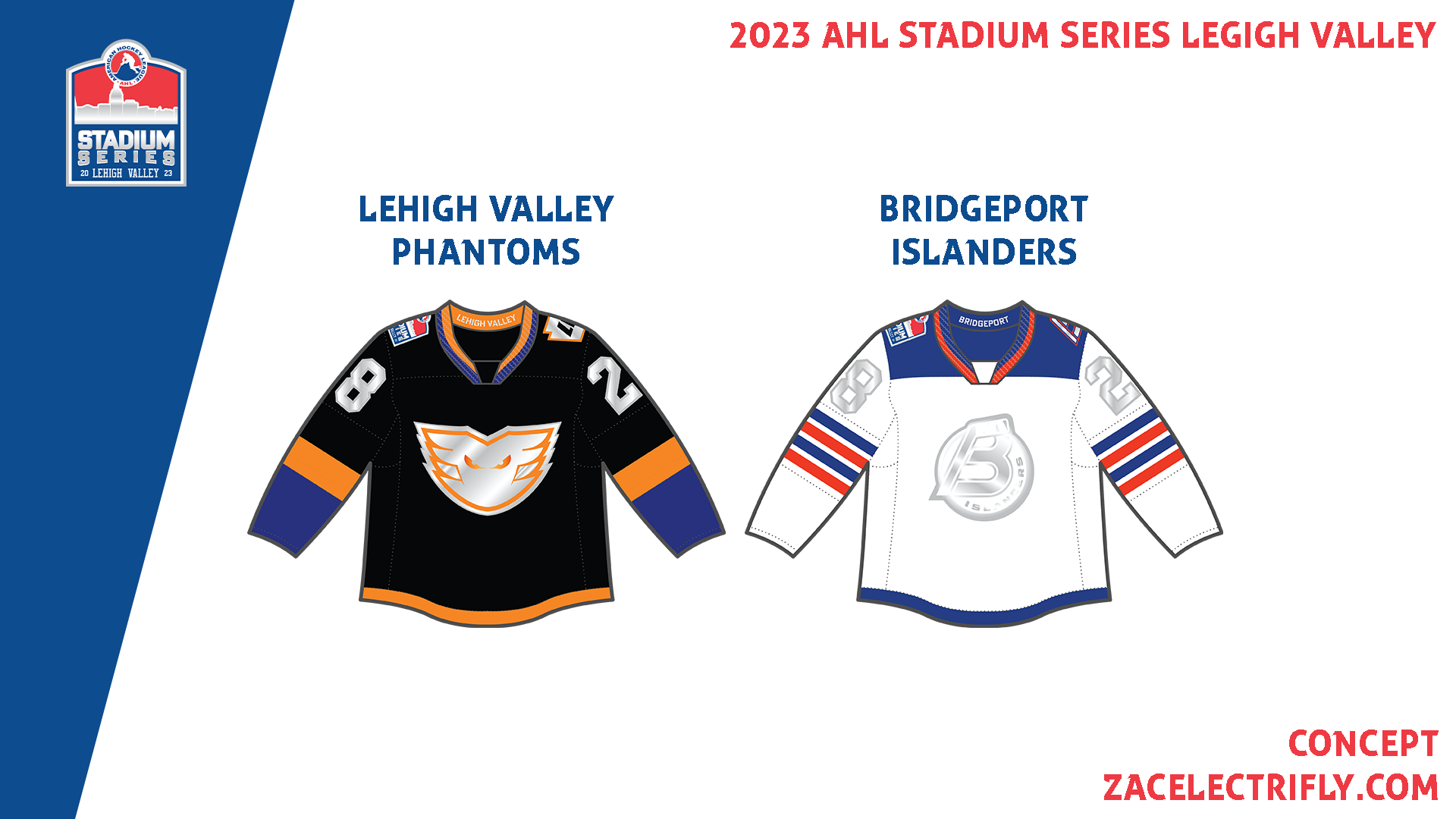 The Lehigh Valley Phantoms jersey is black, orange, purple, and chrome. On the front is the chrome alternate logo. On the shoulder is the chrome keystone logo. On the collar it says Lehigh Valley. The jersey is inspired by the Philadelphia Flyers 50th-anniversary jersey. The Bridgeport Islanders jersey is white, chrome, blue, and orange. It is inspired by some of their other jerseys in this concept as well as the New York Islanders shoulder patch used fro 1998 to 2010. On the front is the chrome primary logo. On the shoulder is the chrome B. On the collar it says Bridgeport. Both jerseys have the event logo on the shoulder as well.
