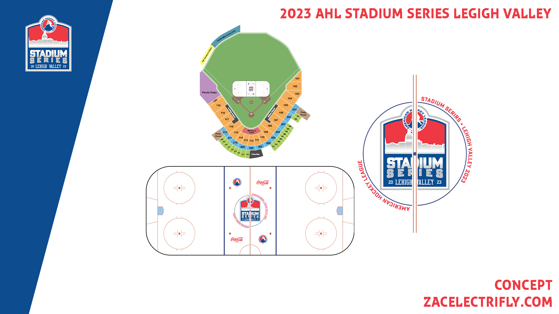 In this concept, the World Division AHL Stadium Series game is at the 10,178-capacity Coca-Cola Park. The stadium is home to the Lehigh Valley Ironpigs of the International League. Coca-Cola Park is only slightly larger than PPL Center, the Lehigh Valley Phantoms home arena. Coca-Cola Park can fit 1,758 more people but has less actual seating. Using the dugouts and bullpen as VIP areas and possibly allowing on field standing room (like the NHL Stadium Series at NC State) they could add a few extra thousand tickets to be sold.