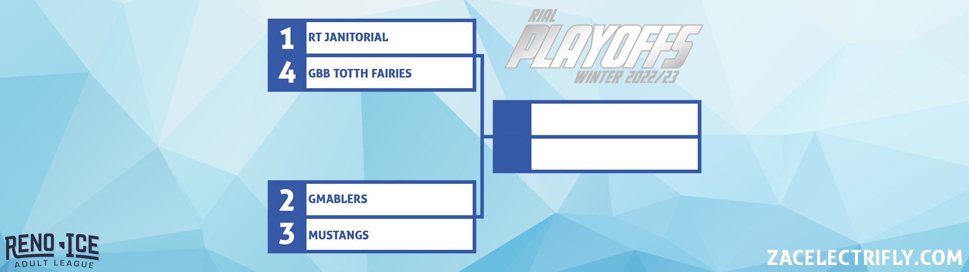 If the playoffs started today RT Janitorial would play the GBB Tooth Fairies in the semifinals. The other semifinal matchup would be the Reno Gamblers and the Mustangs.