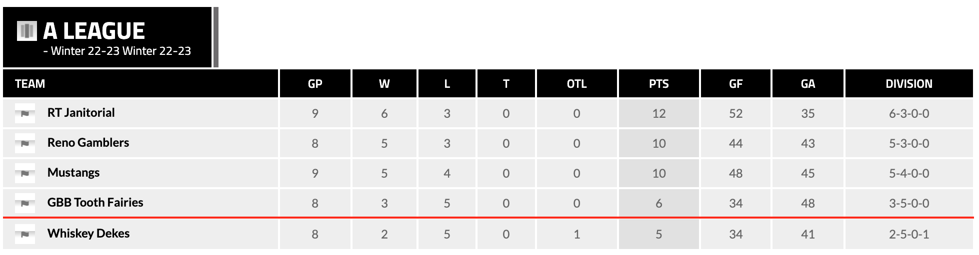 The A-League playoffs are coming down to the last game. The GBB Tooth Fairies and Whiskey Dekes will be fighting it out for the last playoff spot in A-League. They are playing on Thursday. If the game ends in regulation time, the winner will get the last playoff spot. If it ends in a shootout, it will come down to tie-breakers. If Whiskey Dekes wins it will change the playoff bracket.