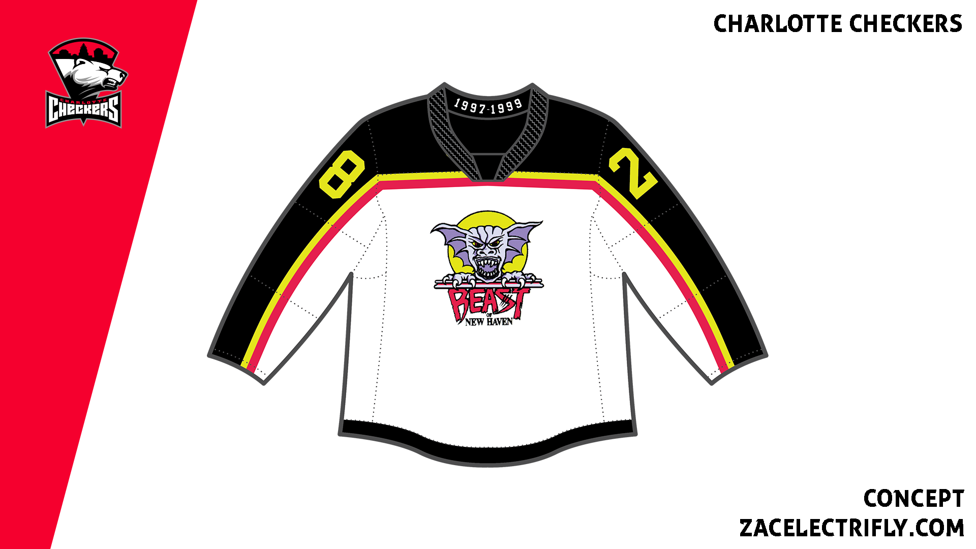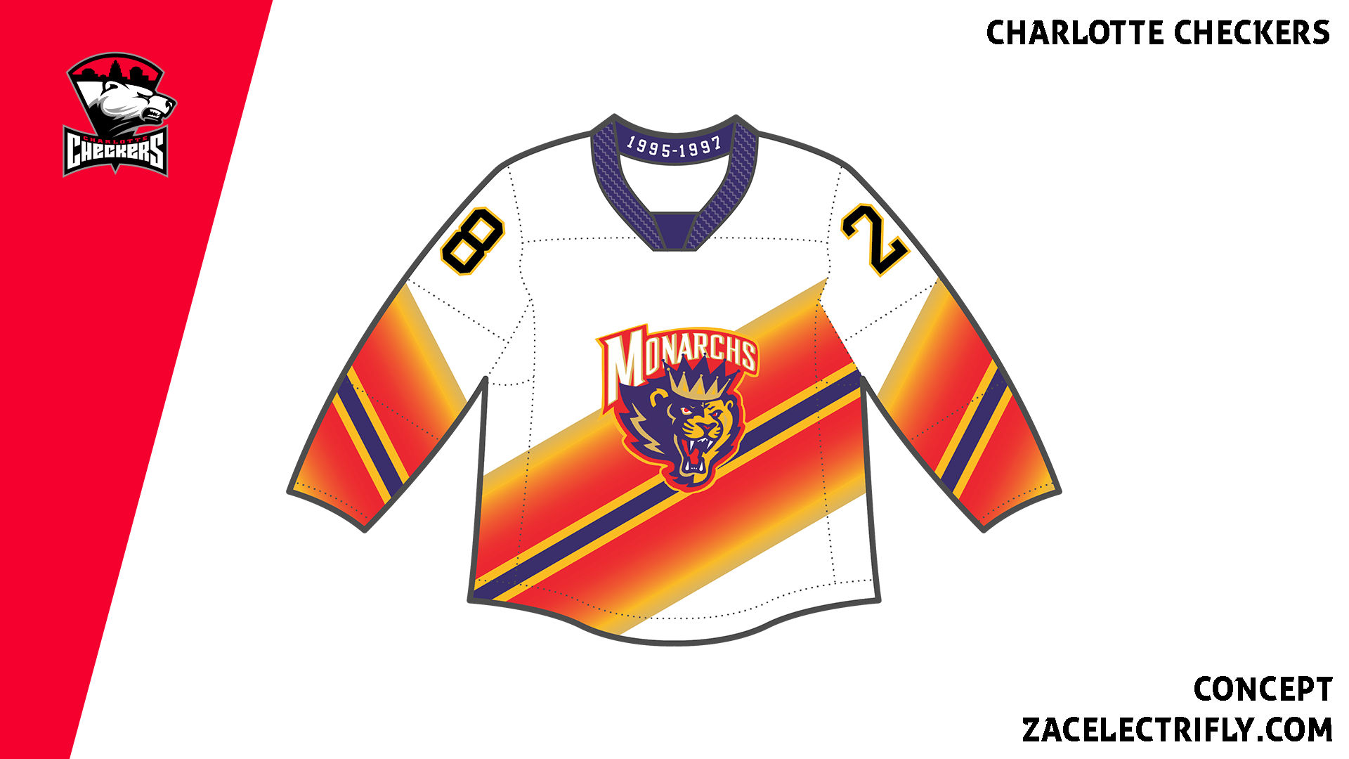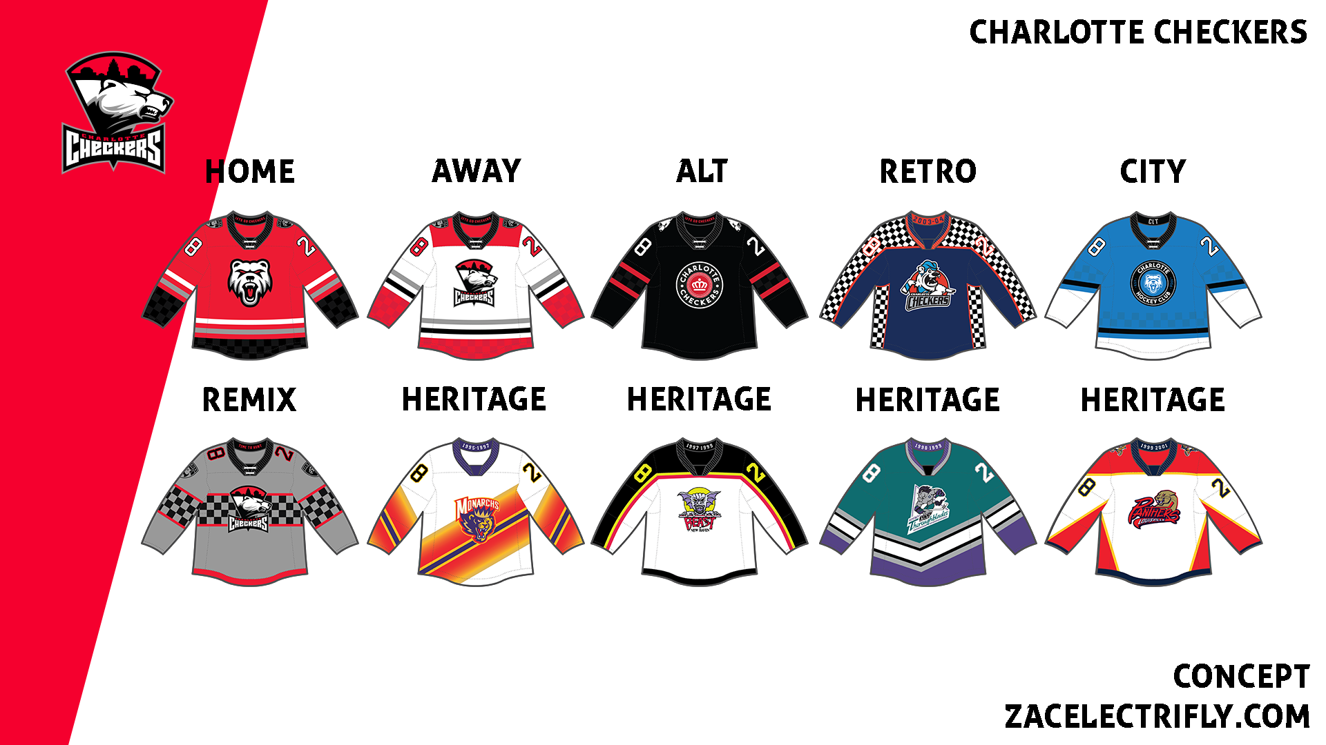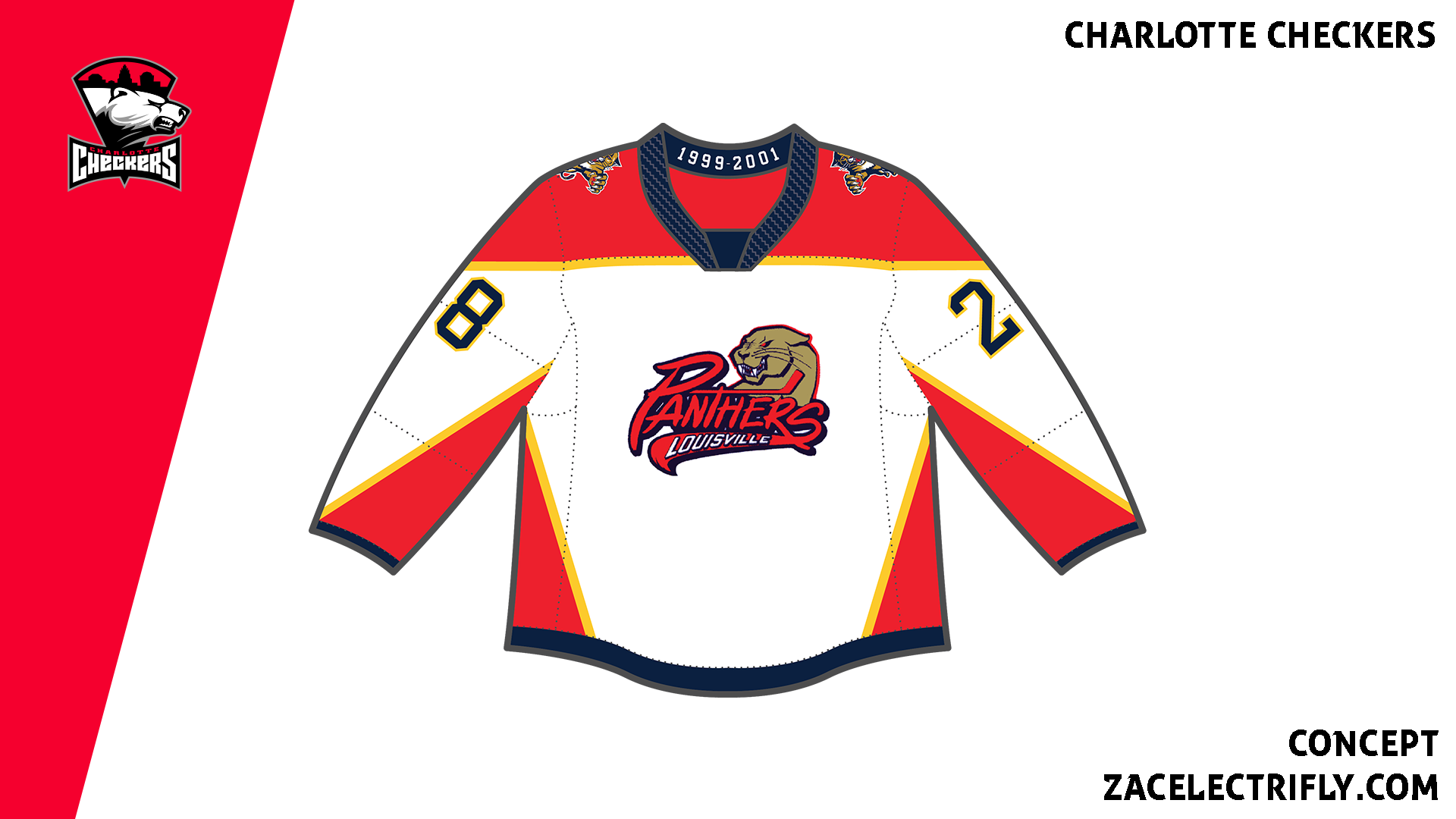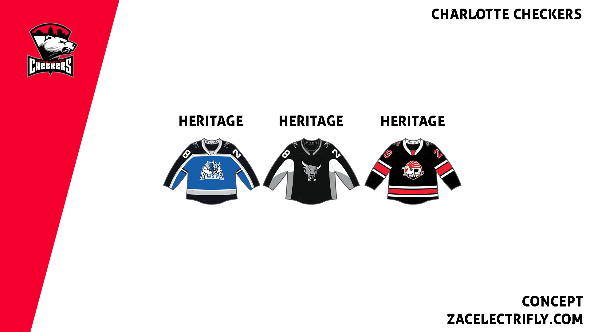 The Checkers have seven Heritage jerseys. The Carolina Monarchs (1995-97), New Haven Beast (1997-99), the Kentucky Thoroughblades (1998-99), the Louisville Panthers (1991-01), the San Antonio Rampage (2002-05 and 2011-15 ), and the Portland Pirates (2015-16). The Heritage jerseys are inspired by the Florida Panthers former primary affiliates. Three of their former affiliates are still in the AHL.