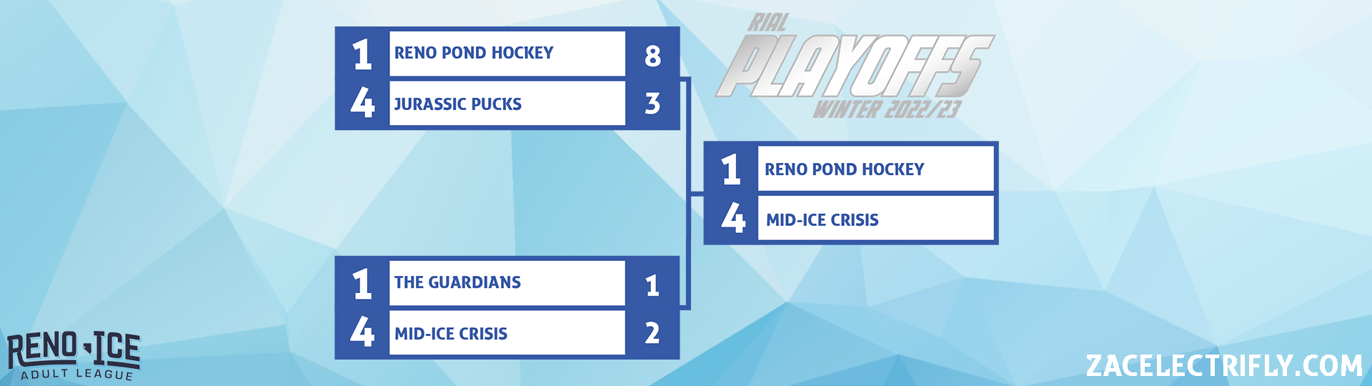 The #2 seed The Guardians played the #3 seed Mid-Ice Crisis in the second RIAL Winter 2022/23 D-League Playoff Semifinal game. Mid-Ice Crisis won the game 2-1. With that result, Mid-Ice Crisis has advanced to the D-League championship game and The Guardians have been eliminated from the playoffs. The D-League Championship game will be on Saturday March 11th at 2:15pm between #1 seed Reno Pond Hockey and the #3 seed Mid-Ice Crisis.