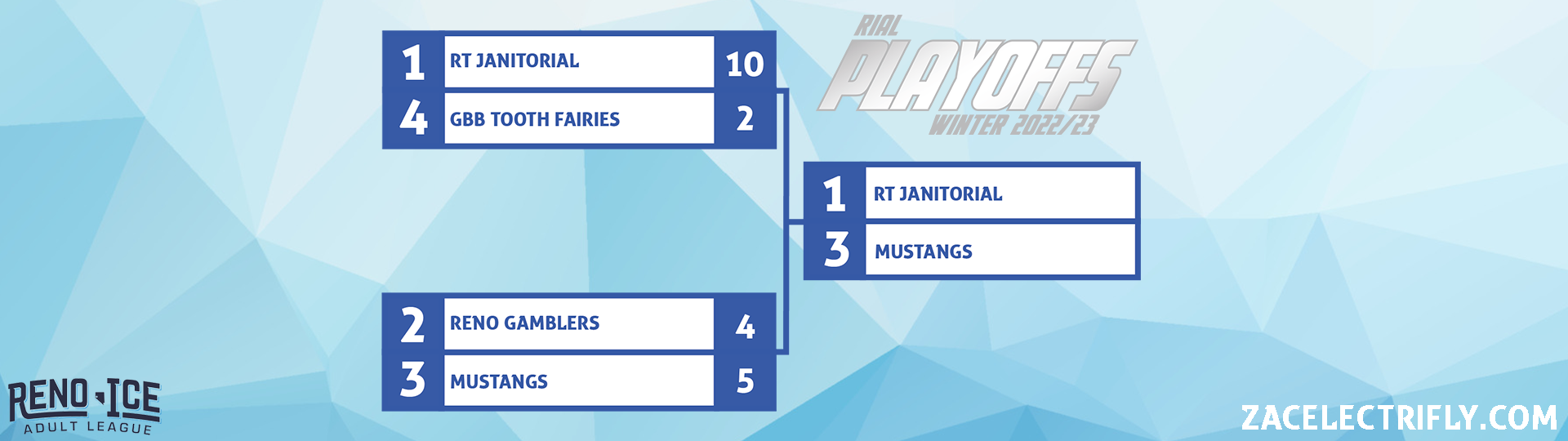 Today is Championship Saturday. The Reno Ice Adult League Winter 2022/23 Playoffs continue today with the championship games. The games start at 2:15pm today at Reno Ice. All three of the championship games will be played back to back. Reno Pond Hockey will play Mid-Ice Crisis. That will be followed by Cruz Construction vs the Tahoe Storm. The last game of the day and season will see RT Janitorial take on the Mustangs. It premisses to be a thrilling championship Saturday with plenty of action and excitement.