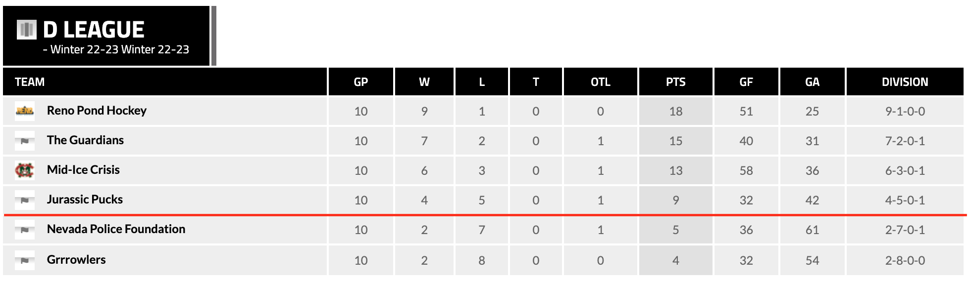 Secured playoff spot: Reno Pond Hockey, The Guardians, Mid-Ice Crisis, Jurassic Pucks