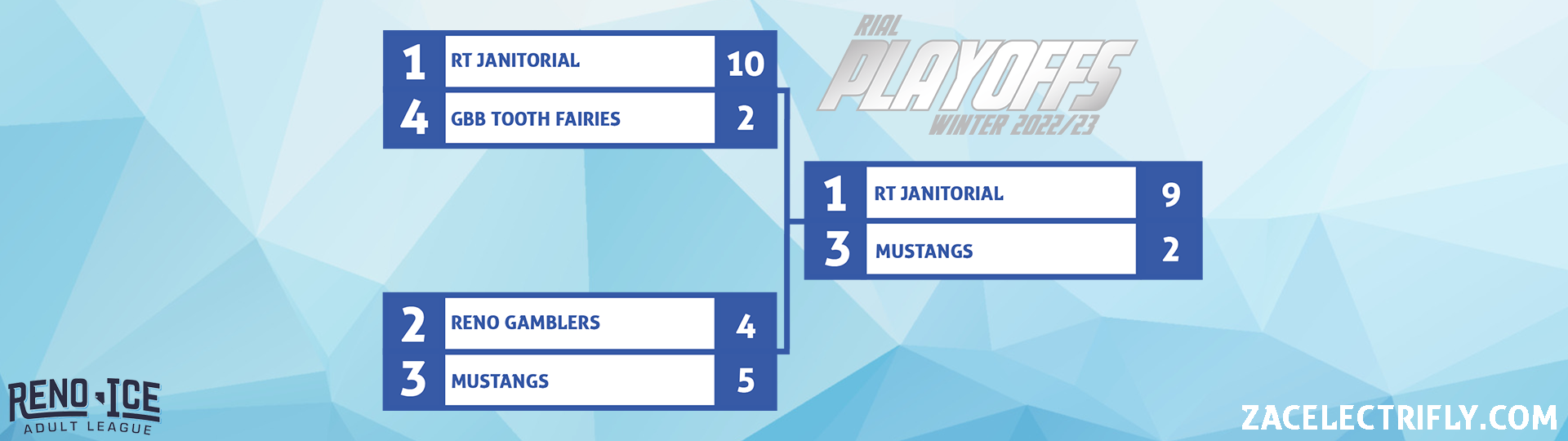 The A-League Championship game was between the #1 seed RT Janitorial and the #3 seed Mustangs. Their head-to-head record this season was tied at 1-1-0 going into the game. The Mustangs were the defending champions going into the game. RT Janitorial won the game in a 9-2 blowout. RT Janitorial is now the RIAL Winter 2022/23 A-League Champions. The Mustangs were eliminated from the playoffs with the loss.