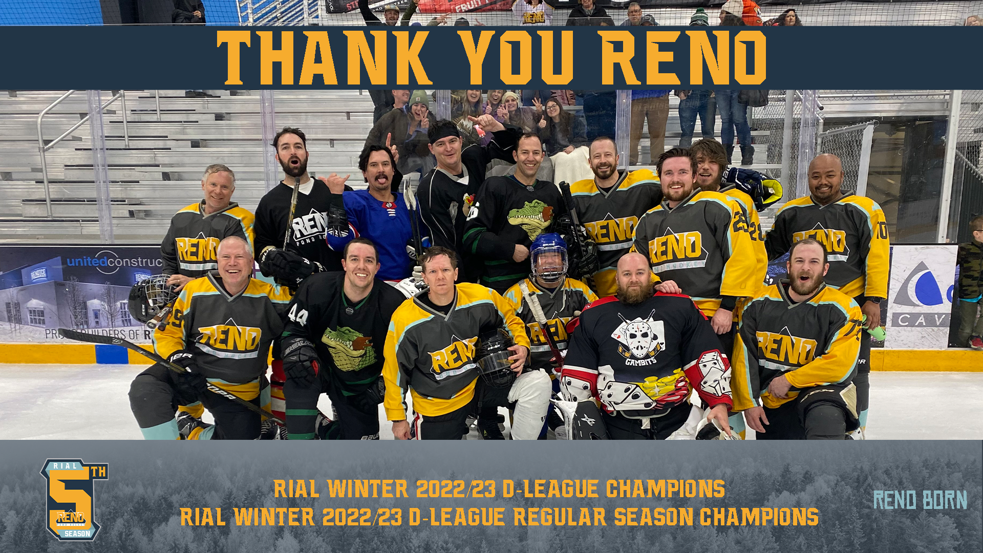 Reno Pond Hockey is the Reno Ice Adult League Winter 2022/23 D-League Champions and Reno Ice Adult League Winter 2022/23 D-League Regular Season Champions.