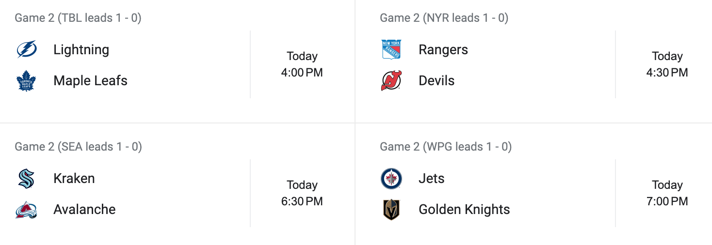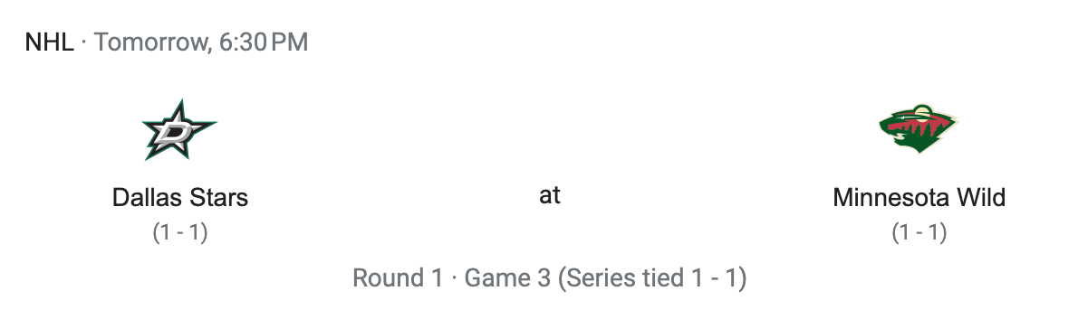 We are full tilt into the Stanley Cup Playoffs. There was four games. In the Eastern Conference, the Carolina Hurricanes played the New York Islanders. The Boston Bruins played the Florida Panthers in the other Eastern Conference game. In the Western Conference the Dallas Stars played the Minnesota Wild. In the other Western Conference game the Los Angeles Kings played the Edmonton Oilers.