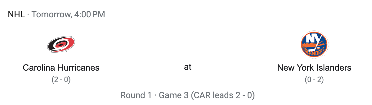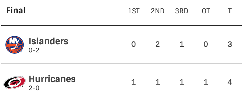 Brock Nelson would score to give the Islanders the lead. Jacob Slavin would score to tie the game back up. The game would go into overtime. Jesper Fast scored in overtime to win the game for the Hurricanes. The final score was 4-3 Hurricanes. The Hurricanes now have a 2-0 series lead over the Islanders as the series shifts to New York.