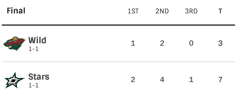 The Minnesota Wild won game one 3-2 over the Dallas Stars in double overtime. That gave them a 1-0 series lead. Roope Hintz would score the opening goal to give the Stars a 1-0 lead while short handed. Tyler Seguin scored on the powerplay to give Stars a 2-0 lead. Oskar Sundqvist would score to get one back for the Wild. The score was 2-1 after the first period.