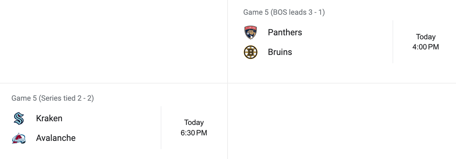 Round one game fives finish up tonight. The Boston Bruins have a chance to eliminate the Florida Panthers with a win tonight. The Seattle Kraken and Colorado Avalanche series is tied. Whoever wins tonight will have the chance to win the series in game six.