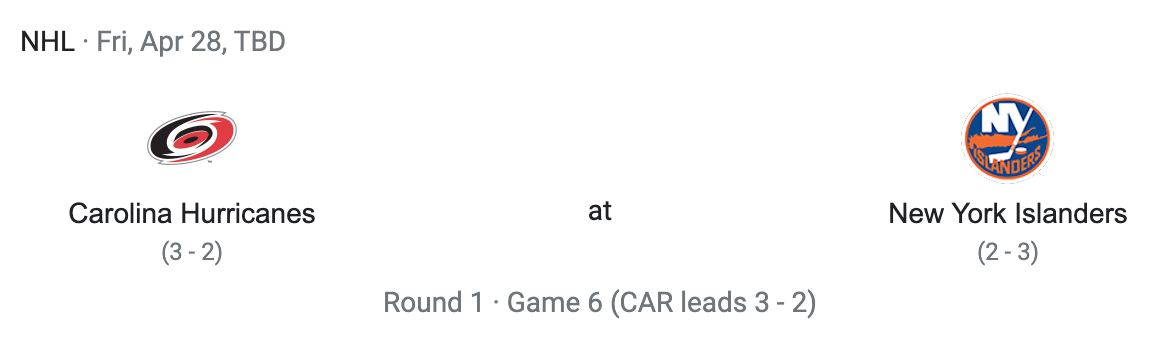 We are now nine days into the Stanley Cup Playoffs. There was three games yesterday. In the Eastern Conference, the Carolina Hurricanes played the New York Islanders. Then in the Western Conference the Dallas Stars played the Minnesota Wild. Ehe other Western Conference game saw the Los Angeles Kings play the Edmonton Oilers.