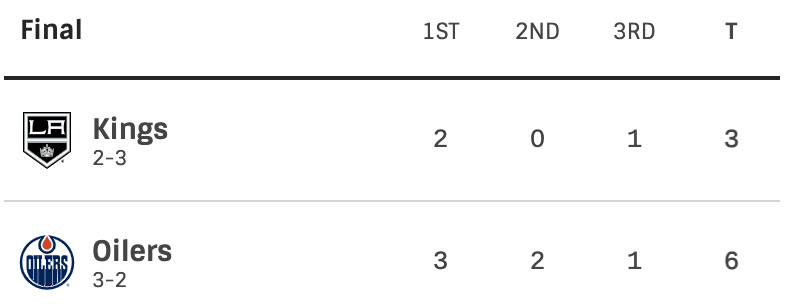 Nick Bjugstad scored his second goal of the game. His goal would put the game way out of reach for the Kings. Quinton Byfield scored the final goal of the game for the Kings. The final score was 6-3 Oilers. The Edmonton Oilers now have a 3-2 series lead over the Los Angeles Kings.