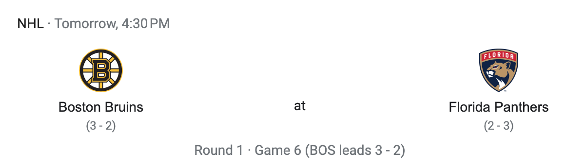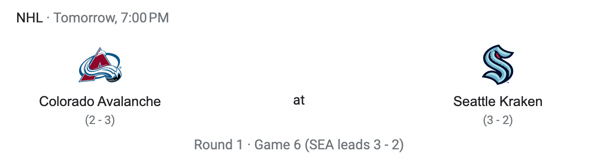 We are now ten days into the Stanley Cup Playoffs. There was two games yesterday. In the Eastern Conference, the Boston Bruins played the Florida Panthers. Then in the Western Conference the Colorado avalanche played the Seattle Kraken.