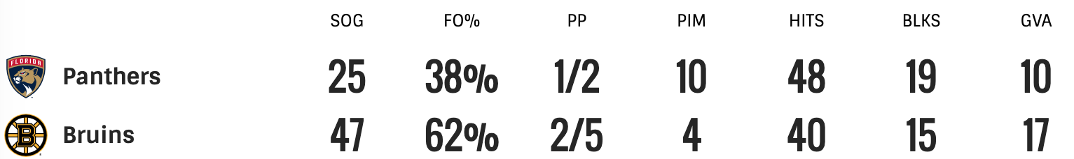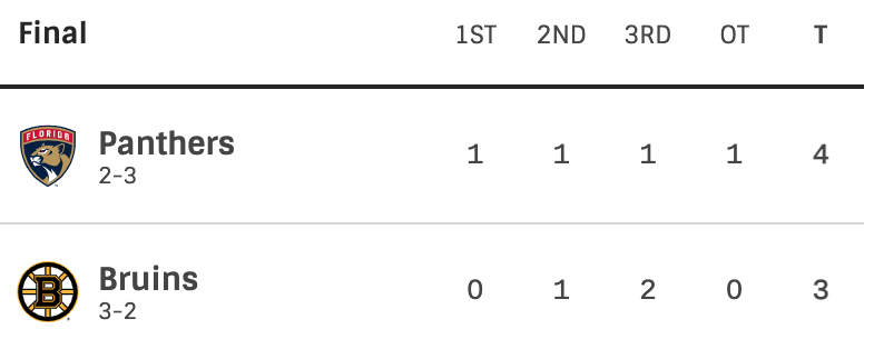 Matthew Tkachuk scored the game winning goal in overtime. His goal would give the Panthers the win. The final score was 4-3 Panthers. The Bruins still lead the series 3-2.