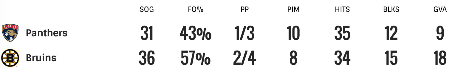 Recapping the series the Bruins won game one 3-1. The Panthers won game two 6-3. The Bruins won game three 4-2. The Bruins won game four 6-2. The Panthers won game five 4-3 in overtime. The Panthers won game six 7-5. The Panthers won game seven 4-3 in overtime.
