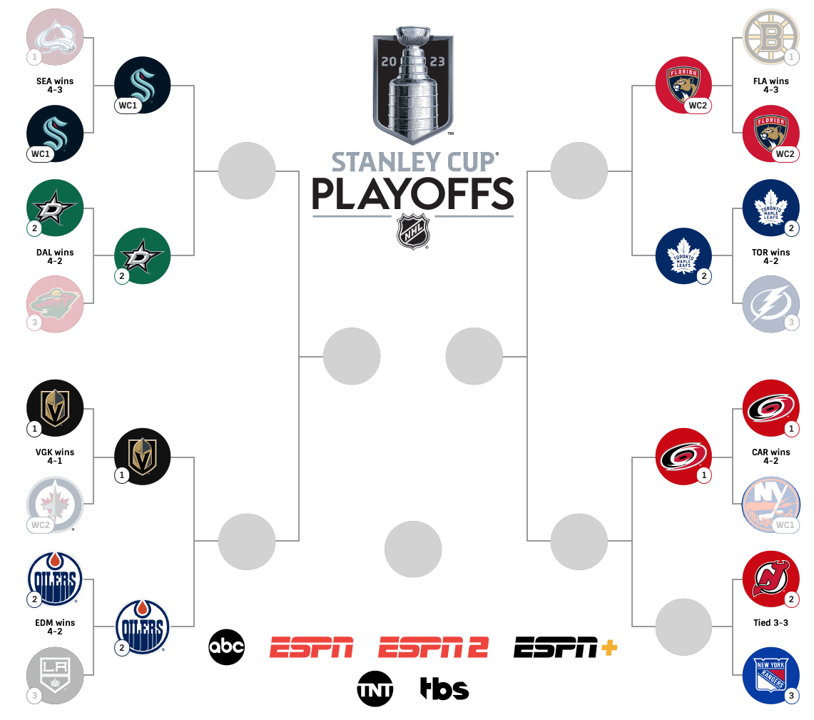 The Vegas Golden Knights, Carolina Hurricanes, Dallas Stars, Toronto Maple Leafs, Edmonton Oilers, Florida Panthers, and Seattle Kraken have advanced to round two. The Winnipeg Jets, New York Islanders, Minnesota Wild, Tampa Bay Lightning, Los Angeles Kings, Boston Bruins, and Colorado Avalanche have been eliminated.