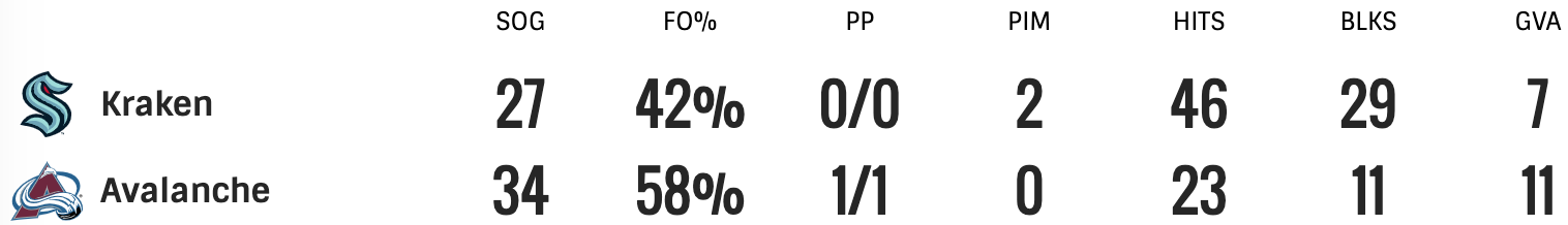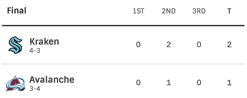 To recap the series the Kraken won game won 3-1 for their first ever playoff win in their first ever playoff game. The Avalanche won game two 3-2. The Avalanche won game three 6-4. The Kraken won game four 3-2 in overtime. The Kraken won game five 3-2. The Avalanche won game six 4-1. The Kraken won game seven 2-1.