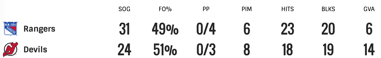 Recapping the series the Rangers won game one 5-1. The Rangers won game two 5-1. The Devils won game three 2-1 in overtime. The Devils won game four 3-1. The Devils won game five 4-0. The Rangers won game six 5-2. The Devils won game seven 4-0. The Devils shutout the Rangers twice in this series. Outside of the first two games and game six the Rangers offense was no where to be found.