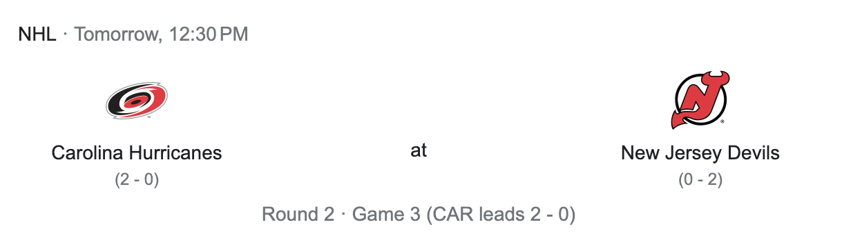 We are now nineteen days into the Stanley Cup Playoffs. There was one game yesterday. In the Eastern Conference the the Carolina Hurricanes played the New Jersey Devils. There is only one game today as well. The Vegas Golden Knights will take on the Edmonton Oilers for their second game of the series.
