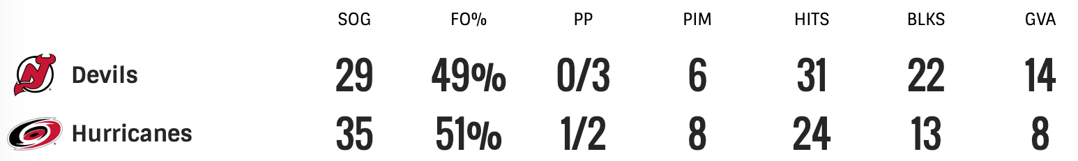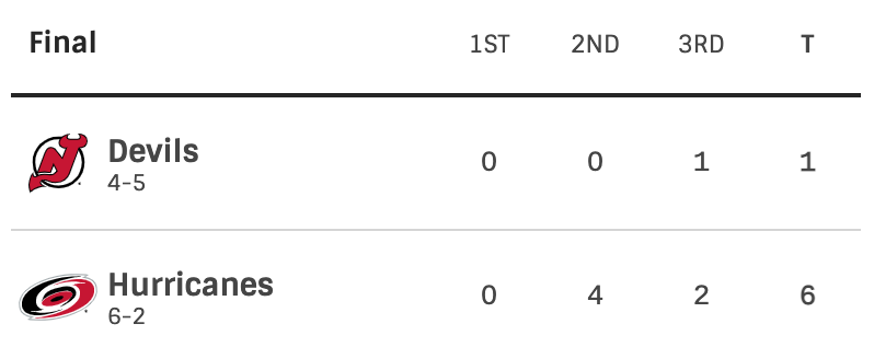 Miles wood scored to get the Devils on the scoreboard. Jordan Martinook then scored for the Hurricanes. Under a minute later Stefan Noesen scored another goal for the Hurricanes. The final score was 6-1 Hurricanes. The Carolina Hurricanes now have a 2-0 series lead oveer the New Jersey Devils.