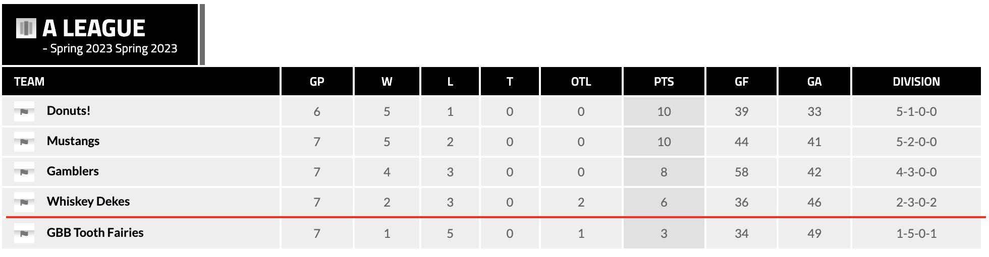 The Whiskey Dekes are only three point into the final playoff spot. The GBB Tooth Fairies would have to win one game and lose in a shootout to tie for the last playoff spot. They could make the playoffs if they win all three of their remaining games. If the GBB Tooth Fairies lose one more game the Reno Gamblers will secure the third playoff spot. A GBB Tooth Fairies loss and a Whiskey Dekes win would eliminate the GBB Tooth Fairies from the playoffs and Whiskey Dekes would secure the final A-League playoff spot.