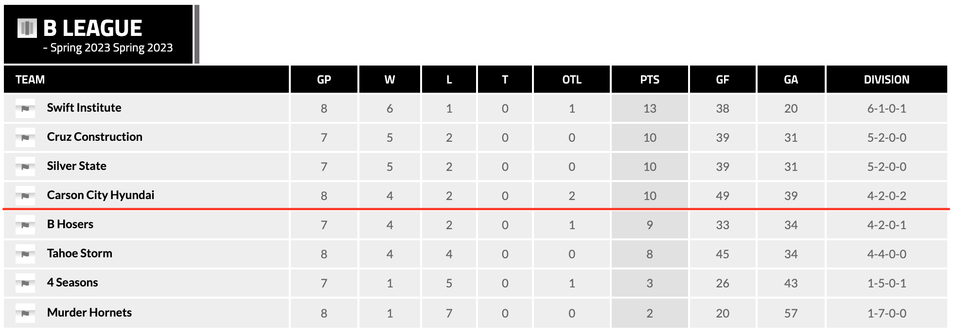 In the B-League, The Swift Institute lead the regular season title race. Cruz Construction, Silver State Wire, and Carson City Hyundai are all behind by three points (a win and a shootout loss). The Reno Fire Hosers B are behind by four points (two wins). The Tahoe Storm, 4 Seasons, and the Murder Hornets are out of the regular season title race.