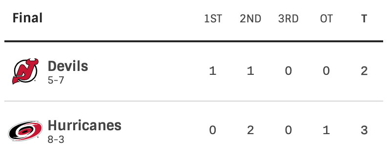 The New Jersey Devils have been eliminated in round two. The Carolina Hurricanes have advanced to the Eastern Conference Finals