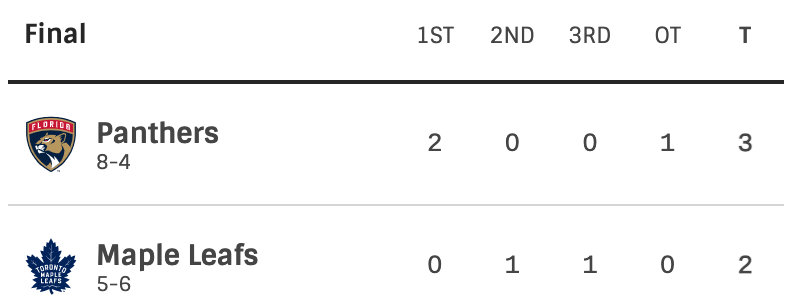 Nickk Cousins scored in overtime to win the game. His Goal gave the Panthers the game and series win. With that win the Florida Panthers advances to the Eastern Conference finals. The Toronto Maple Leafs are now eliminated from the playoffs.