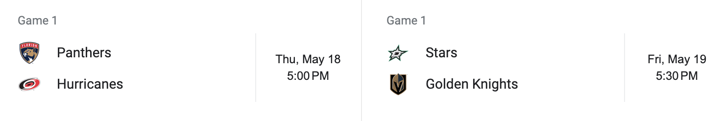 The Conference Finals start on Thursday, May 18th, 2023. Game one of the Eastern Conference Finals between the Carolina Hurricanes and Florida Panthers will be on Thursday, May 18th, 2023 at 5:00pm PST. Game one of the Western Conference Finals between the Vegas Golden Knights and Dallas Stars will be on Friday, May 19th, 2023 at 5:30pm PST. The Conference Finals will be on back to back days up to May 31st, 2023. We are now roughly fourteen or less days away from the 2023 Stanley Cup Finals.