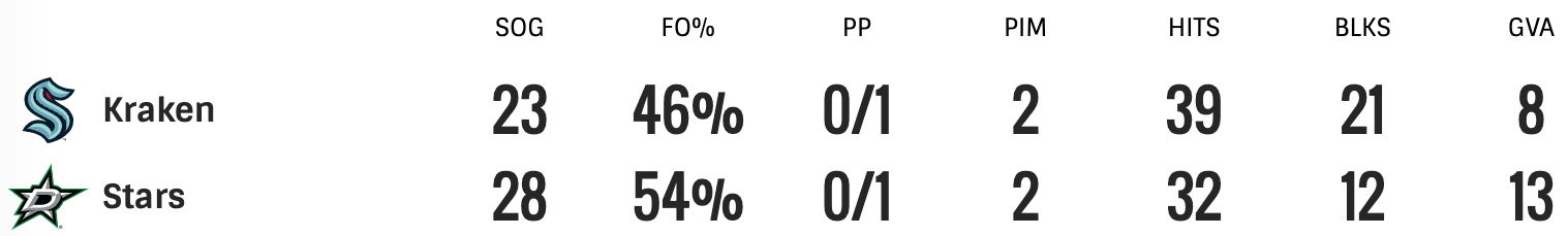 This was another close game in a back and fourth series. This was only the second game in this series though that was within one goal. The Shots in this one were close. Neither team was able to take advantage on the powerplay. The hits were close. The only thing separating these teams in this game was Wyatt Johnstons goal. Seattle had a good run for their first ever playoffs. Losing by one goal in game seven of round two is not a bad way to go out.