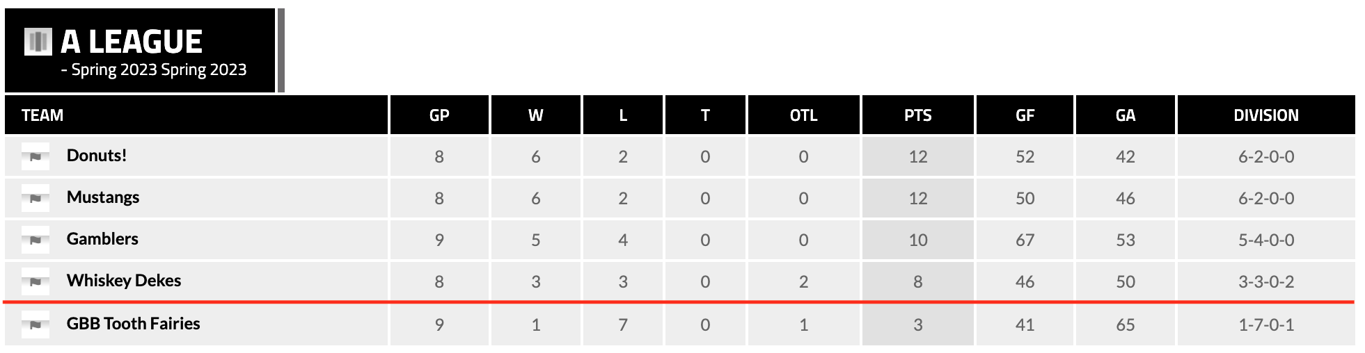 In the A-League, the Doughboy’s Donuts!, the Mustangs, and the Whiskey Dekes have secured playoff spots. The GBB Tooth Fairies have been eliminated from playoff contention. The A-League teams have one or two games remaining in the regular season.