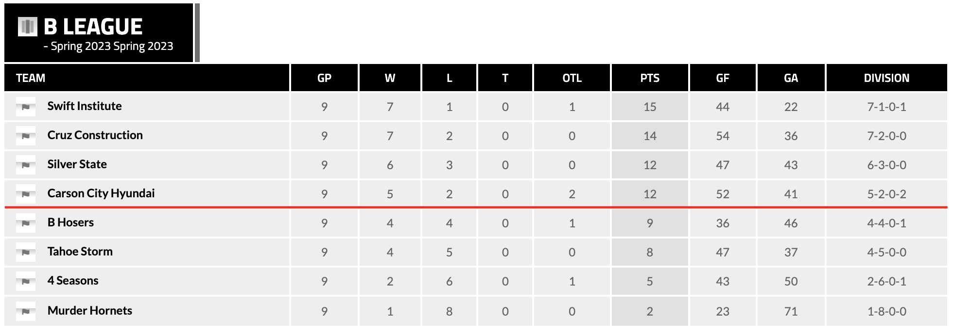 Carson City Hyundais latest 3-2 win over the Tahoe Storm got them the extra point needed to make the playoffs. The Reno Fire Hosers B are going to miss out by one to three points. The Tahoe Storm are going to miss the playoffs by two to four points.