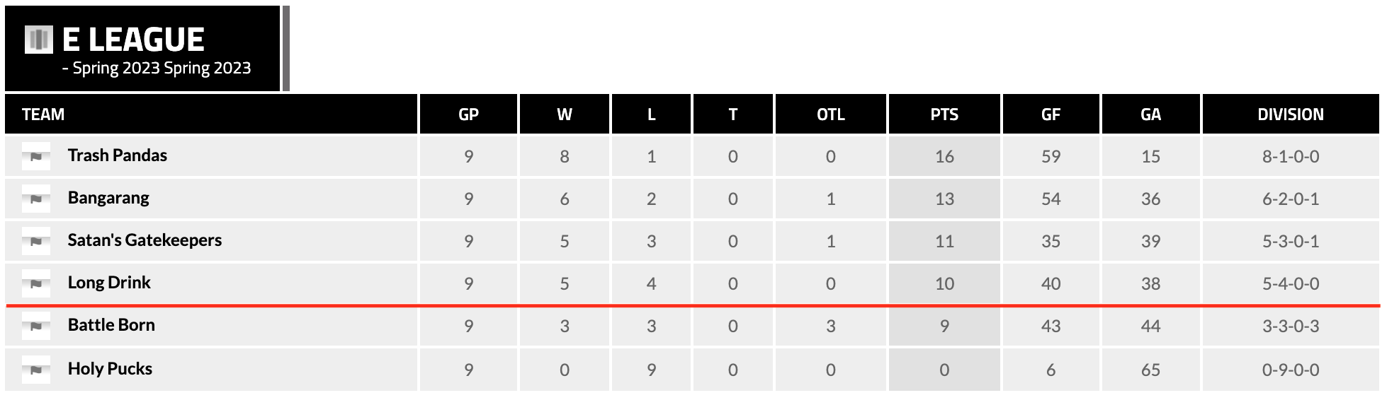 In the E-League, Bangarang and the Trash Pandas are still the only teams to secured playoff spots. The Holy Pucks have been eliminated from playoff contention. In the E-League teams have one game remaining.