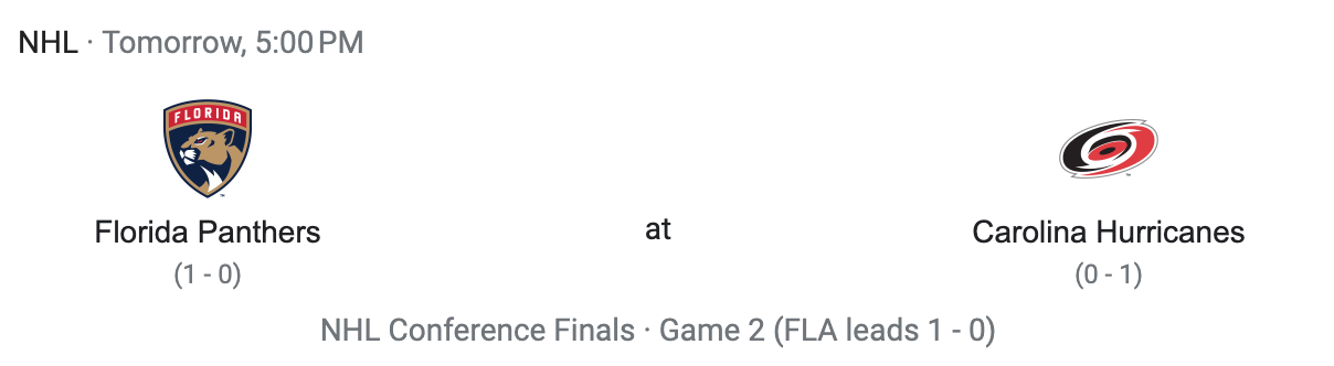 We are now thirty two days into the Stanley Cup Playoffs. The Eastern Conference Finals started yesterday with game one of the series between the Carolina Hurricanes and Florida Panthers. The Western Conference Finals start today. That will start with game one of the Vegas Golden Knights and the Dallas Stars series. Last night had plenty of action. Today promises to bring the action as well.