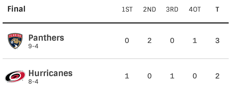 This was an absolutely insane game. They played the equivalent of two games and an extra period. It was a close game. after game one I expect this to be a close series. This seems to be a good matchup. The only thing that stands out on the score sheet is Panthers not scoring on any of their powerplays. Will powerplays give the Hurricanes an advantage in this series? How will the Hurricanes respond in game two? Will the Panthers continue to find ways to win? Will there be more overtime in this series?