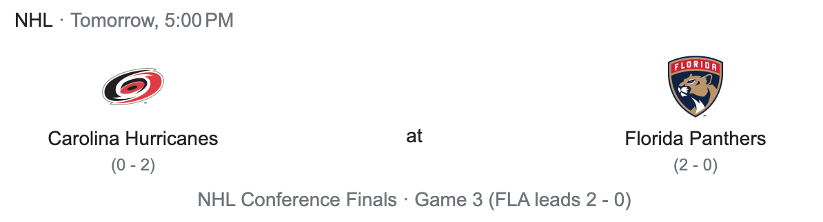 We are now thirty four days into the Stanley Cup Playoffs. There was one game yesterday. Yesterdays game was game two of the Eastern Conference Finals. That series is between the Carolina Hurricanes and Florida Panthers. There is one game going on today. That game is game two of the Western Conference Finals. That series is between the Vegas Golden Knights and Dallas Stars.