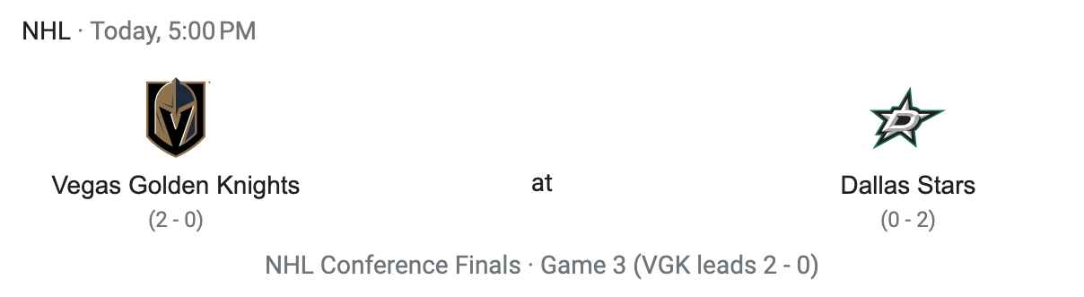 Game three of the Western Conference Finals is today. The Vegas Golden Knights have a 2-0 lead over the Dallas Stars in that series. The Golden Knights won both of the first two games in overtime. Will the home crowd help the Stars get the edge they need to beat the Golden Knights? Will the Golden Knights continue to find ways to win? How will the Stars respond in a critical game three? Will there be more overtime?
