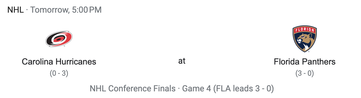 We are now thirty six days into the Stanley Cup Playoffs. There was one game yesterday. Yesterdays game was game three of the Eastern Conference Finals. That series is between the Carolina Hurricanes and Florida Panthers. There is one game going on today. That game is game three of the Western Conference Finals. That series is between the Vegas Golden Knights and Dallas Stars.