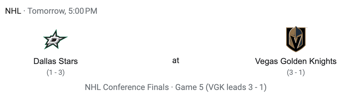 We are now thirty nine days into the Stanley Cup Playoffs. There was one game yesterday. Yesterdays game was game four of the Western Conference Finals between the Vegas Golden Knights and Dallas Stars. The Golden Knights had the chance to sweep that series. There are no games going on today. The Golden Knights and Stars series is the only one happening right now. That series will return tomorrow.