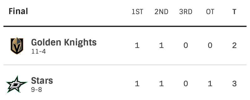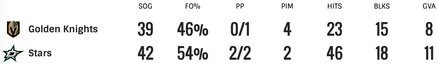 Neither team scored in the third period. The game would head into overtime with the score still tied at 2-2. Jose Pavelski scored on the powerplay early in overtime. His goal won the game for the Stars. The Golden Knights now lead the series 3-2.