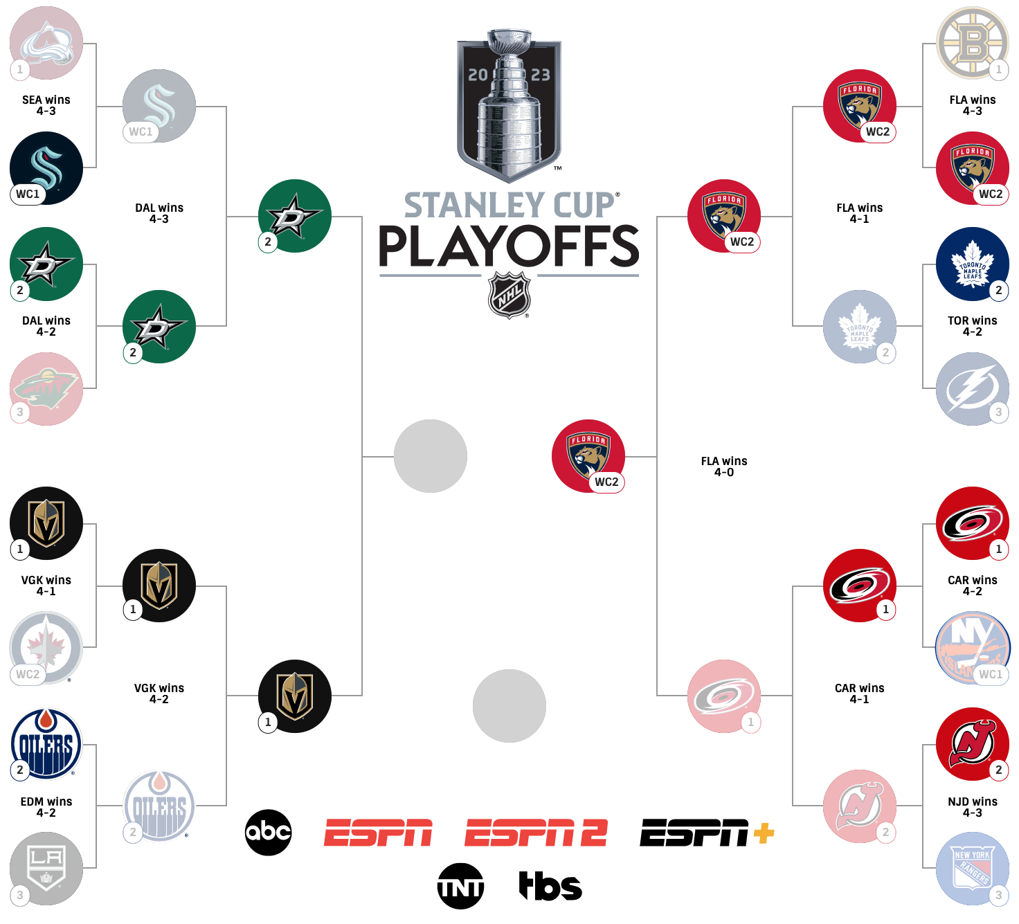The Carolina Hurricanes and Florida Panthers advanced to the Eastern Conference Finals. The Vegas Golden Knights and Dallas Stars advanced to the Western Conference Finals. The New Jersey Devils, Toronto Maple Leafs, Edmonton Oilers, and Seattle Kraken have been eliminated in round two.