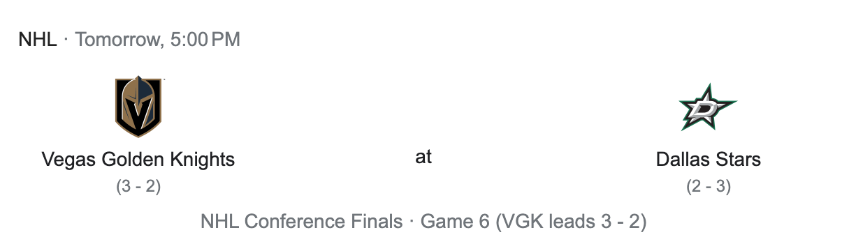 We are now forty one days into the Stanley Cup Playoffs. There was one game yesterday. Yesterdays game was game five of the Western Conference Finals between the Vegas Golden Knights and Dallas Stars. The Golden Knights had the chance to win that series. There are no games going on today. The Golden Knights and Stars series is the only one happening right now. That series will return tomorrow.