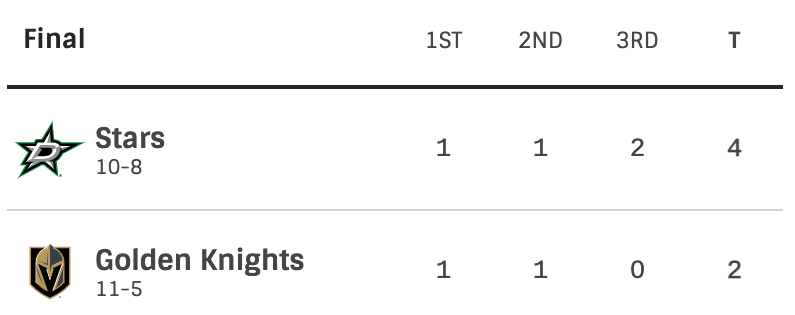 Chandler Stephenson scored early in the second period. His goal gave the Golden Knights the lead. Jason Robertson scored to tie the game a few minutes later. The score was tied at 2-2 heading into the third period.